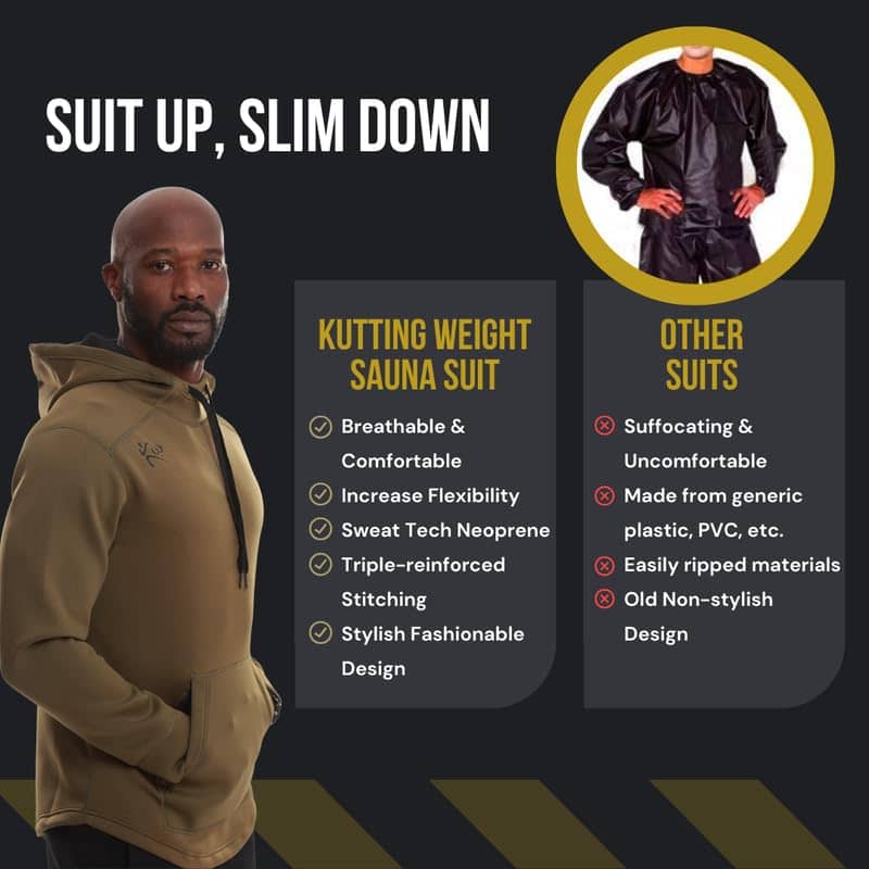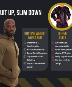 1. ¡Vístete y adelgaza! ¡Tonifica tu cuerpo mientras entrenas con nuestra Sudadera con capucha Sauna V4 de Kutting Weight! Disfruta de ropa de ejercicio que maximiza cada entrenamiento aclimatándote a una temperatura corporal elevada de forma segura y efectiva. No es solo un accesorio; está recomendado por profesionales. 2. MATERIAL EXCEPCIONAL – Este material termogénico de ejercicio está hecho de nuestro neopreno elástico SweatTech de 1.5 mm, que se mueve con tu cuerpo durante cualquier tipo de entrenamiento. Lleva tus resultados al siguiente nivel, generando un buen sudor y quemando más calorías durante todo el año. 3. ESTILO FITNESS – Esto es más que una prenda de entrenamiento con calor; es una pieza versátil para añadir a tu guardarropa de entrenamiento. Esta sudadera con capucha Sauna tiene un cordón y es totalmente de neopreno para maximizar el entrenamiento con calor que recibes. Calidad premium a un precio inmejorable. 4. CALENTAMIENTO PARA TODO CLIMA – Nuestra ropa de compresión termogénica te mantiene caliente y seco para que puedas seguir entrenando en cualquier clima. Esta sudadera para sudar se puede colocar fácilmente sobre tu otra ropa de Kutting Weight. El diseño de doble capa es cómodo y transpirable sin sacrificar el calor. 5. TECNOLOGÍA CIENTÍFICAMENTE COMPROBADA – Se ha demostrado que este equipo apoya diferencias notables en la composición corporal en comparación con el ejercicio realizado en condiciones similares sin la ropa de Kutting Weight.