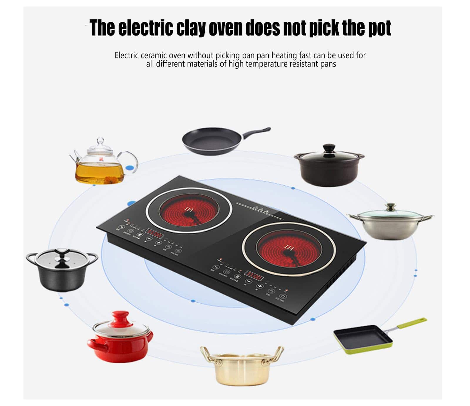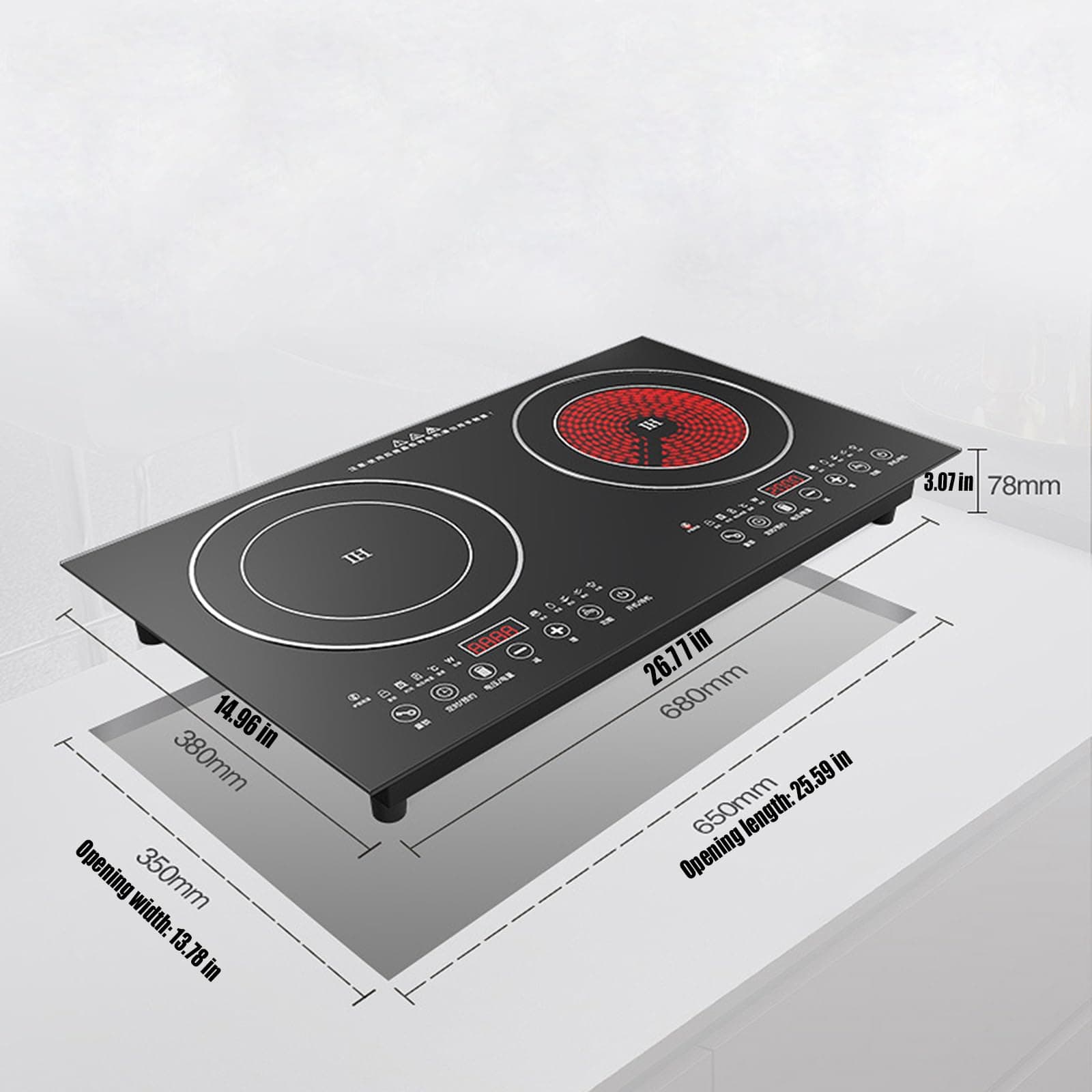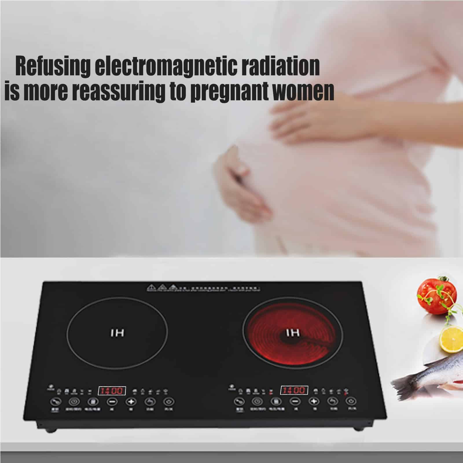 2. Medio Ambiente Protegido y No Radiación: No hay llama abierta en todo el proceso, sin monóxido de carbono; a través del calentamiento por infrarrojos, sin radiación electromagnética, y cada Zona de Cocción se puede programar de forma independiente, interruptor táctil de panel de cristal negro, resistente al agua y a la humedad, fácil de limpiar.