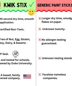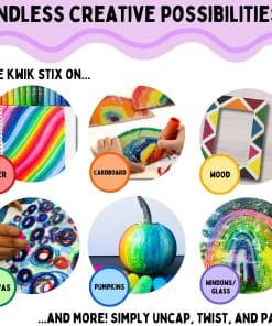 Descubre la magia de las Pinturas Kwik Stix, lo último en suministros de arte para niños. Estos palos de pintura tempera redefinen el arte infantil con su fórmula de secado rápido, que se seca en menos de 90 segundos para una experiencia sin desorden. Ideal para diversas superficies, desde papel hasta lienzo, hacen que el arte sea divertido y sin complicaciones. El diseño único de giro y pintura de Kwik Stix permite un fácil control del flujo de pintura, perfecto para proyectos creativos en madera, cerámica y vidrio. Esta característica fácil de usar los convierte en una elección versátil en el kit de herramientas de cualquier joven artista. La naturaleza lavable de Kwik Stix garantiza una limpieza sin estrés, ideal para arte espontáneo en materiales no convencionales como rocas o calabazas. Como suministros de arte esenciales para niños pequeños, prometen que no habrá manchas obstinadas, lo que los convierte en favoritos tanto para padres como para profesores. La seguridad es una prioridad principal con Kwik Stix. Probados por Toxicología de Duke y portando el Sello AP, estas pinturas no tóxicas son libres de alérgenos, asegurando un ambiente seguro para que los niños exploren su creatividad. Kwik Stix ofrece una variedad vibrante de 96 colores clásicos, incluidos 8 de cada uno de los 12 tonos clásicos. Estos bolígrafos de pintura para niños no son solo herramientas de arte, sino portales a posibilidades creativas, perfectas para proyectos escolares y manualidades educativas. Adecuados para artistas de todas las edades, Kwik Stix funciona en diversas superficies, mejorando su versatilidad. Son una parte indispensable de los suministros de arte para niños, fomentando la creatividad en múltiples medios. En esencia, las Pinturas Kwik Stix son más que solo pintura para niños pequeños; son un camino hacia la confianza y el crecimiento artístico. Fomentando las habilidades motoras finas y el juego imaginativo, abren un mundo colorido de creatividad para cada joven artista. Con Kwik Stix, el arte es seguro, limpio y muy emocionante, lo que los convierte en un básico en la colección de cada joven creador.
