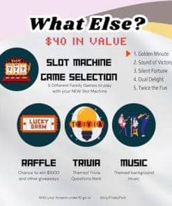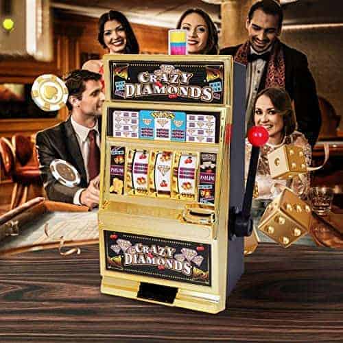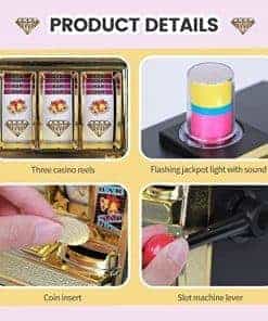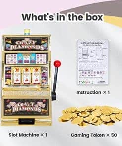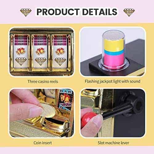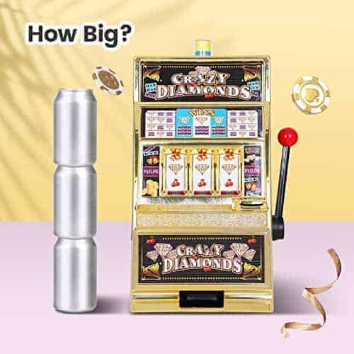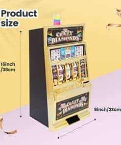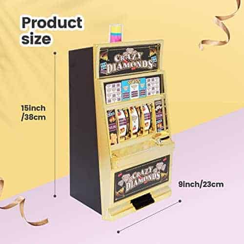 Esta réplica a gran escala de una máquina tragamonedas viene con sonidos de casino, luz de jackpot intermitente y carretes giratorios. También sirve como una pequeña alcancía ATM con una sección de ahorro separada y acepta el 98% de las monedas del mundo. Incluye 50 fichas metálicas de juego, ideal para usar como decoración de fiesta de casino. Acepta el 98% de las monedas del mundo, con retornos manuales y de jackpot. Carretes giratorios anchos, sonido de campana de jackpot y luz intermitente. Se adapta a cualquier entorno hogareño. Contiene aproximadamente 20 monedas en el frente y alrededor de 100 monedas en la parte trasera. Retornos manuales y de jackpot. Requiere 2 pilas AA para la luz y la campana (no incluidas). Dimensiones del producto: 15 pulgadas de alto x 9.1 pulgadas de ancho x 6.7 pulgadas de profundidad.
