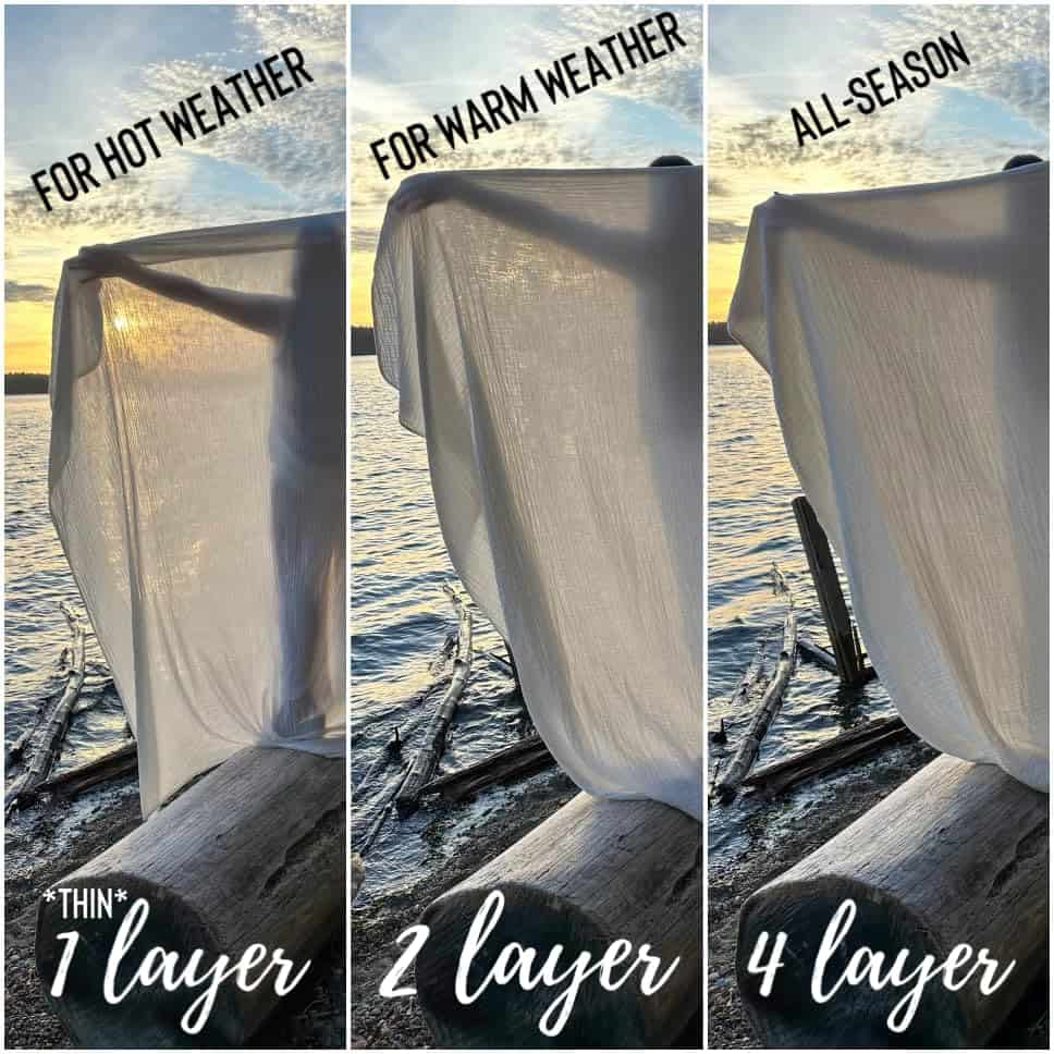 La querida manta de muselina para adultos. De tamaño perfecto, transpirable y garantía de satisfacción de nuestra pequeña empresa! 1 CAPA: Perfecto para clima extra cálido y húmedo. Compacto para llevar en vacaciones. Ideal para personas que duermen calientes. También ayuda a dormir cómodamente durante sofocos, menopausia o fiebres. 2 CAPAS: Ideal para veranos en la mayoría de climas. Agradable para clima tropical durante noches frescas. Ligero y aireado con un poco de calor. Amigable para personas que duermen calientes. 4 CAPAS: Para todas las estaciones – evita los sudores nocturnos igual que las versiones más delgadas – pero con calor y peso acogedor durante todo el año!