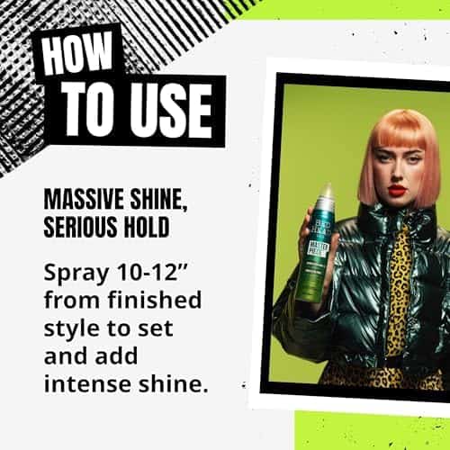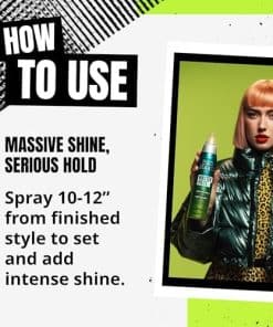 Instrucciones: Mantenga el aerosol a 8-10 pulgadas del cabello y rocíe sobre el cabello peinado o rocíe en áreas deseadas. Para un toque final, mantenga a 10-12 pulgadas del cabello en ráfagas cortas sobre el peinado terminado.