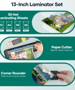 Este conjunto todo en uno incluye una máquina laminadora de 13 pulgadas que viene con una cortadora de papel, 50 bolsas de laminado caliente y un redondeador de esquinas, para ahorrar dinero y esfuerzo. La máquina es compatible con bolsas de laminado de 3-5 mil y se ajusta a múltiples tamaños de papel de hasta A3. La cortadora de papel y el redondeador de esquinas seguros y prácticos están diseñados para necesidades de corte adicionales. Las 50 hojas de laminado térmico de alta calidad vienen en 4 tamaños populares (5 A3, 10 A4, 15 A5, 20 A6) para satisfacer diferentes demandas. El material PET brillante suave es resistente al agua, grasa y suciedad, las láminas de laminado son capaces de proteger sus documentos importantes y fotos antiguas durante décadas, manteniendo vivos sus preciosos recuerdos.