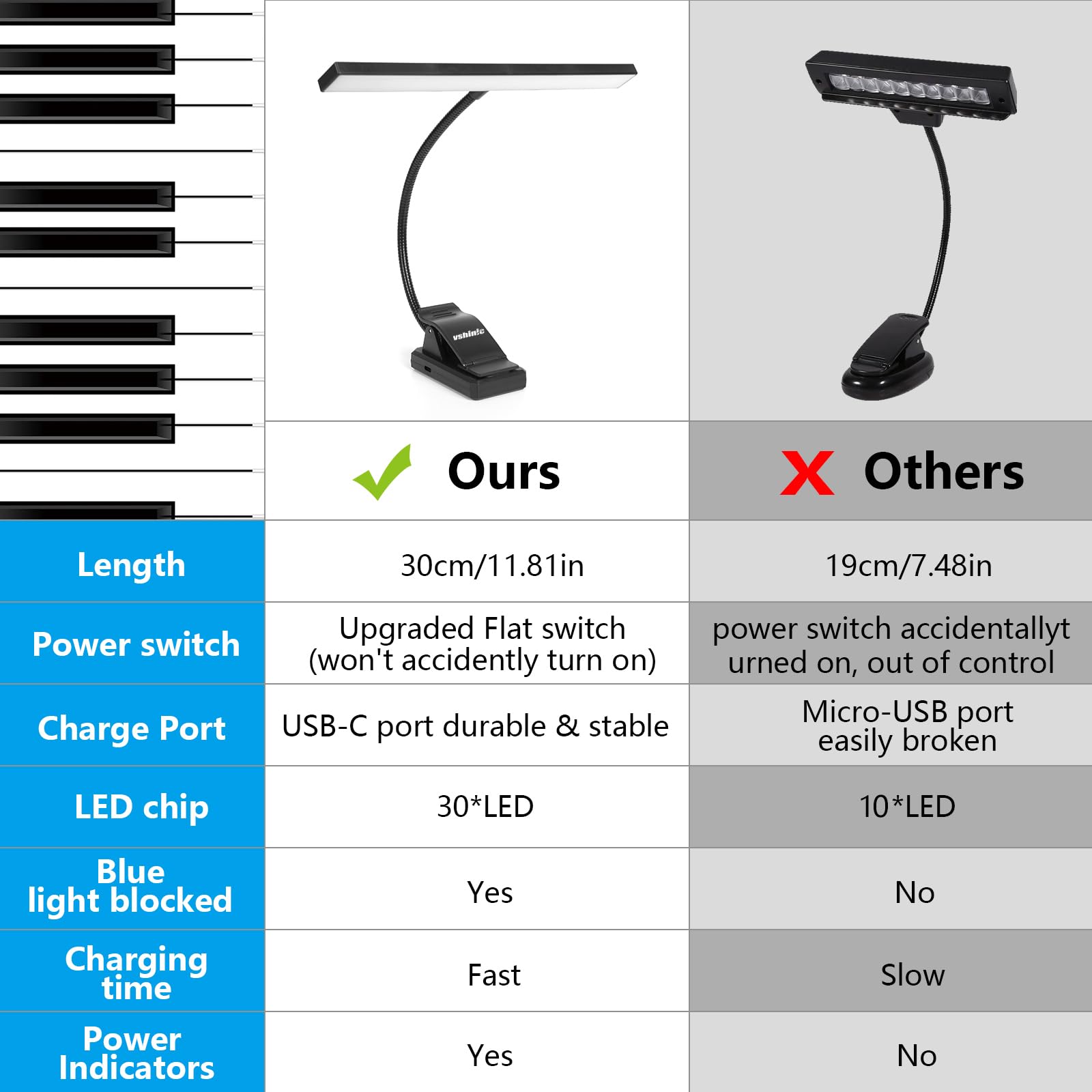 Lámpara de atril Vshinic, 30 LED, Pinza de Luz para Piano,