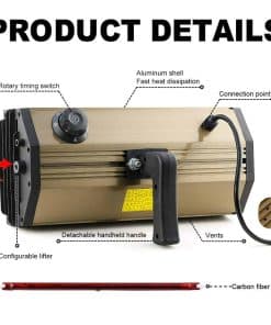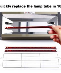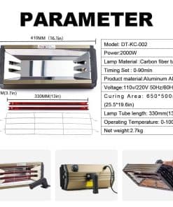 Modelo: DT-KC-02Plus Voltaje: 110V 50Hz/60Hz Potencia: 2000W Área de Curado: 650 500mm Longitud del Tubo de la Lámpara: 330mm Temporizador: 0-90min Temperatura de Operación: 30-100 Material del Producto: Aleación de Aluminio Peso Neto: 5kg. Características: 1: Diseño de mango seguro para evitar lesiones accidentales debido al contacto a alta temperatura. El mango se puede desmontar. 2: Hay agujeros de tornillo en ambos lados del fuselaje, se pueden agregar soportes o ensamblar varias luces para usar juntas según sea necesario. 3: Tubo infrarrojo de onda corta, vida útil de hasta 6000 horas bajo uso normal. 4: El interior utiliza un reflector especialmente diseñado con alta reflectividad, que hace que la distribución del calor sea más uniforme y acorta el tiempo de curado. 5: Cable de alimentación super largo de 2.5M (8.2 pies) para satisfacer diversas necesidades de trabajo. Amplio rango de aplicación: ampliamente utilizado en pintura de chapa de metal, secado parcial de muebles, desempañado y deshumidificación, pintura de coches, etc.