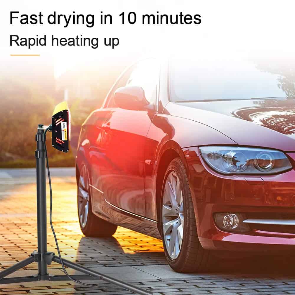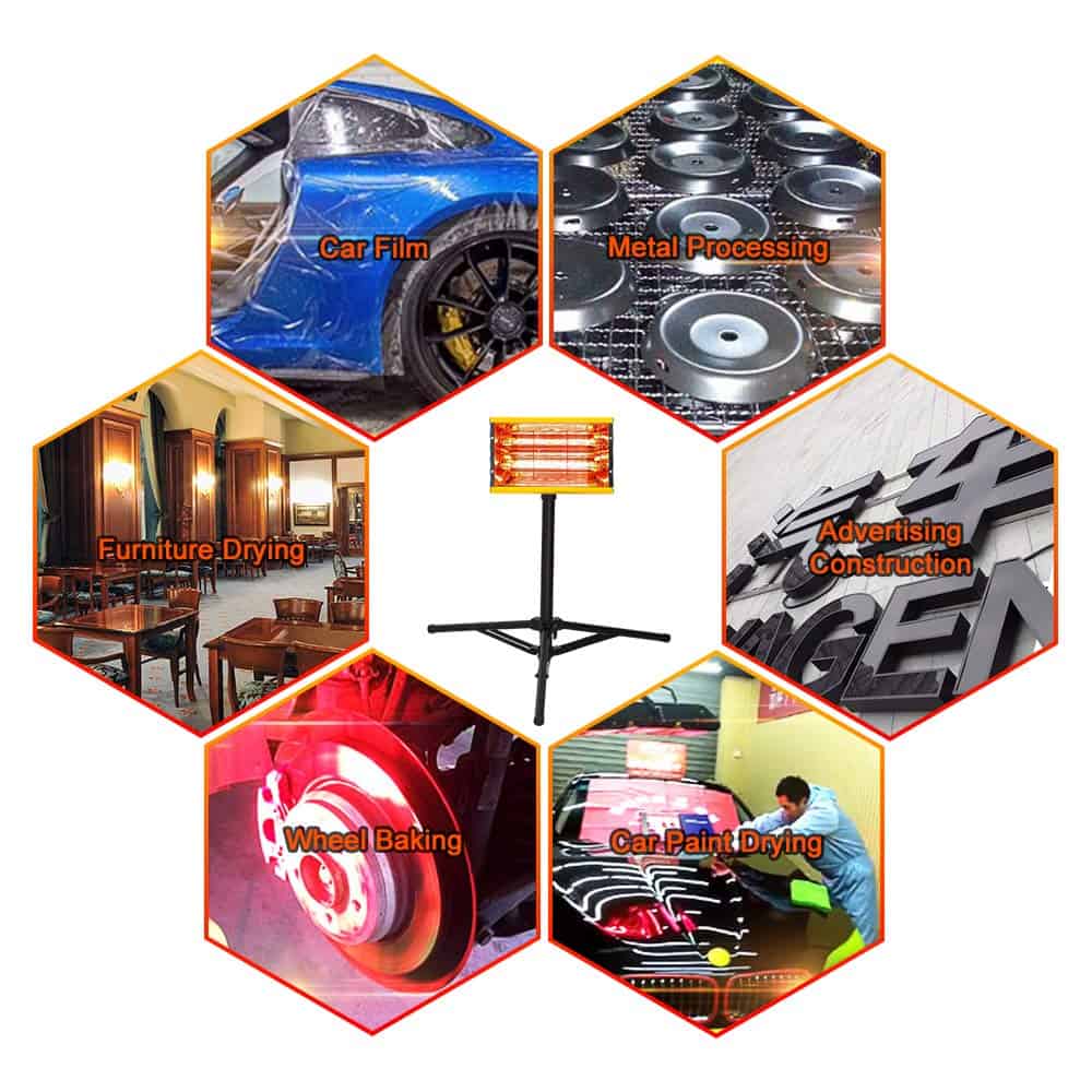 5. DIVERSAS APLICACIONES Las lámparas de curado infrarrojas se utilizan ampliamente en la sala de pintura para automóviles, secado de pintura local, secado de masilla, cabina de horneado de pintura para autos, y es la herramienta de pintura ideal para reparaciones localizadas, secado de motores, eliminación de rayas adhesivas, secado de masilla, secado de imprimación o simplemente precalentamiento antes de pulverizar.