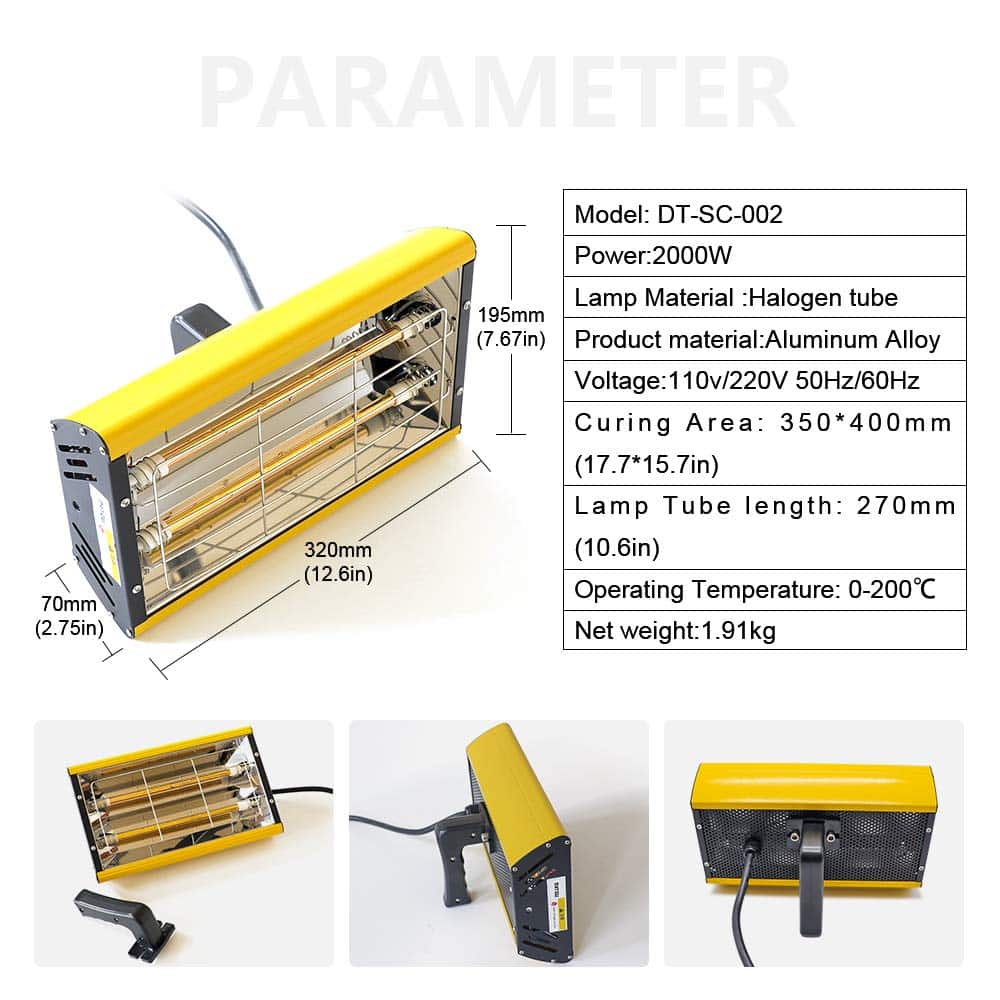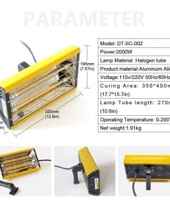 1. ÁREA DE CURADO Esta lámpara de horneado de pintura puede curar 30 20cm (11.8 7.87 pulgadas), y la temperatura de trabajo puede alcanzar 60-80 C (140-176 F). Equipado con una potente lámpara de infrarrojos de onda corta de 2000 W, que puede hacer que el calor fluya de nuevo a través del recubrimiento por conducción.