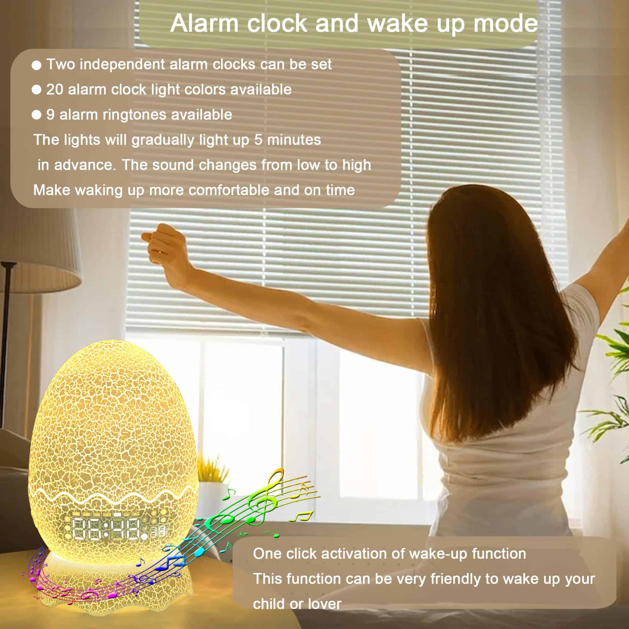 1. Lámpara de noche exquisita con mariposa nueva estilo. Luces LED RGB emiten 16 colores, iluminando el patrón de mariposa exquisito. Es una gran luz de camping / luz de ambiente / luz de escritorio para el dormitorio y la sala de estar, o decoración ideal para la oficina. 2. Modo de despertador + Modo de sueño. Hay 4 marchas: 10min / 20min / 30min / apagado. Después de seleccionar el modo, el dispositivo se quedará durante 3 segundos y luego entrará en el modo de despertador o modo de sueño. El sistema aumentará la luz y el sonido al valor establecido por el usuario dentro de los 30 segundos. Después de entrar en el modo de sueño, el sistema reducirá gradualmente el brillo y el volumen de las luces. 3. Reloj digital + despertador. Reloj digital y visualización del día de la semana en el cascarón de huevo. Se pueden configurar 2 alarmas. Mientras la alarma funciona, la luz se ilumina 5 minutos antes, el sonido aumenta de 0 a alto. Es una alarma suave, no estridente. Amigable para niños y ancianos. 4. Bluetooth + altavoz. Al activar Bluetooth, se puede vincular a dispositivos multimedia como teléfonos móviles y otros reproductores de medios para usarlo como altavoz Bluetooth. 5. Regalo perfecto. Esta lámpara de huevo con mariposas es un regalo creativo y una gran decoración para el hogar. La forma de huevo única es genial e increíbles efectos, haciéndola perfecta para niños, niñas, niños y adultos. Es el regalo perfecto para familiares y amigos.