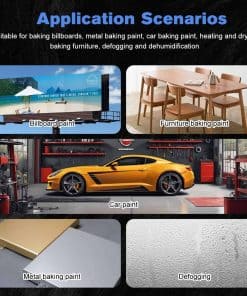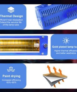 Versátil en sus aplicaciones, esta lámpara de curado por infrarrojos es ampliamente utilizada en salas de pintura de automóviles para el secado de pintura local y el curado de masilla. Es perfecta para reparaciones puntuales y secado de motores, incluido el secado efectivo de masillas y aparejos.