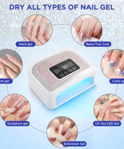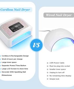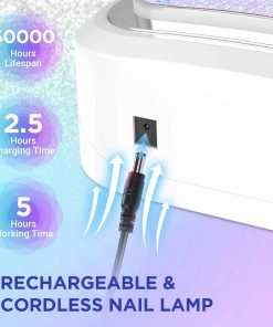 Lámpara de uñas UV para uñas: fuente de luz de doble LED + UV que emite una luz suave de 365+405 nm que es suave y amigable para tu piel. No producirá deslumbramiento/quemaduras ni bronceará tu piel. Lámpara de uñas sin cable: uso continuo de 2-5 horas después de una carga completa de 3 horas. La pantalla LCD te indicará cuándo es necesario cargar. La lámpara de uñas UV portátil se puede llevar a cualquier lugar sin el cable de alimentación. (Nota: no se recomienda utilizar la lámpara de uñas mientras se carga). La luz para uñas en gel tiene una gran pantalla LCD táctil completa con 4 ajustes de temporizador (30′, 60′, 90′, 120′ modo de baja temperatura). Sensor automático: control con 1 dedo con facilidad. Manos adentro, luces encendidas. Perfecto para entusiastas del arte de uñas DIY y arte de uñas de calidad de salón sin ningún control manual adicional. Curando todos los geles: la luz UV para uñas funciona con todas las marcas de gel. Base/capa superior, Color/Duro/Poly/Sculpture Gels, Builder, Acrílico, Pegamento de Gemas, etc. (no apto para esmalte de uñas regular/secado al aire.) Disfruta de manicuras de salón de alta calidad en casa con tus amigos y familiares.