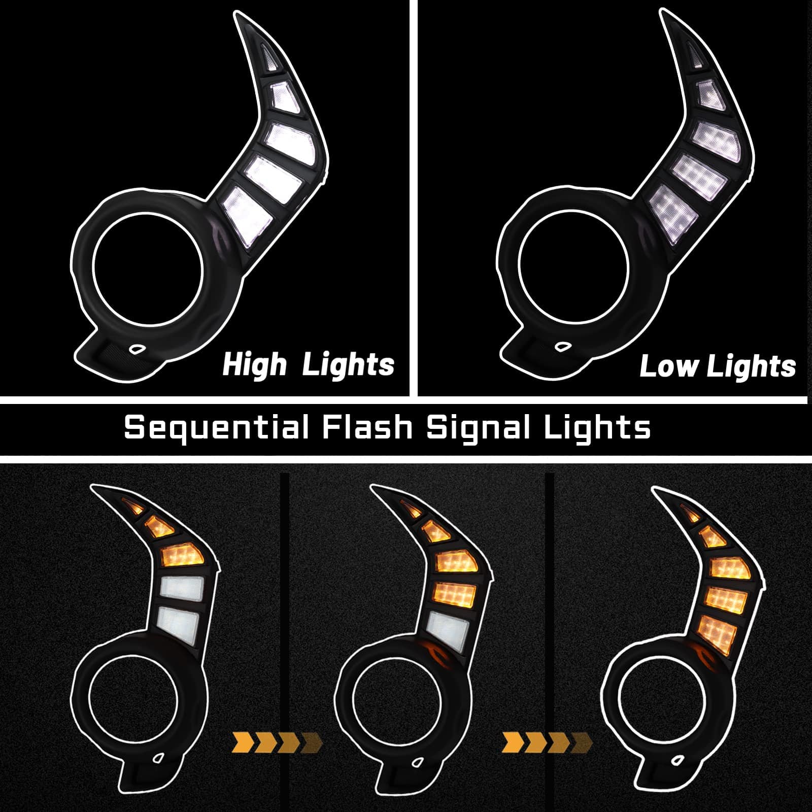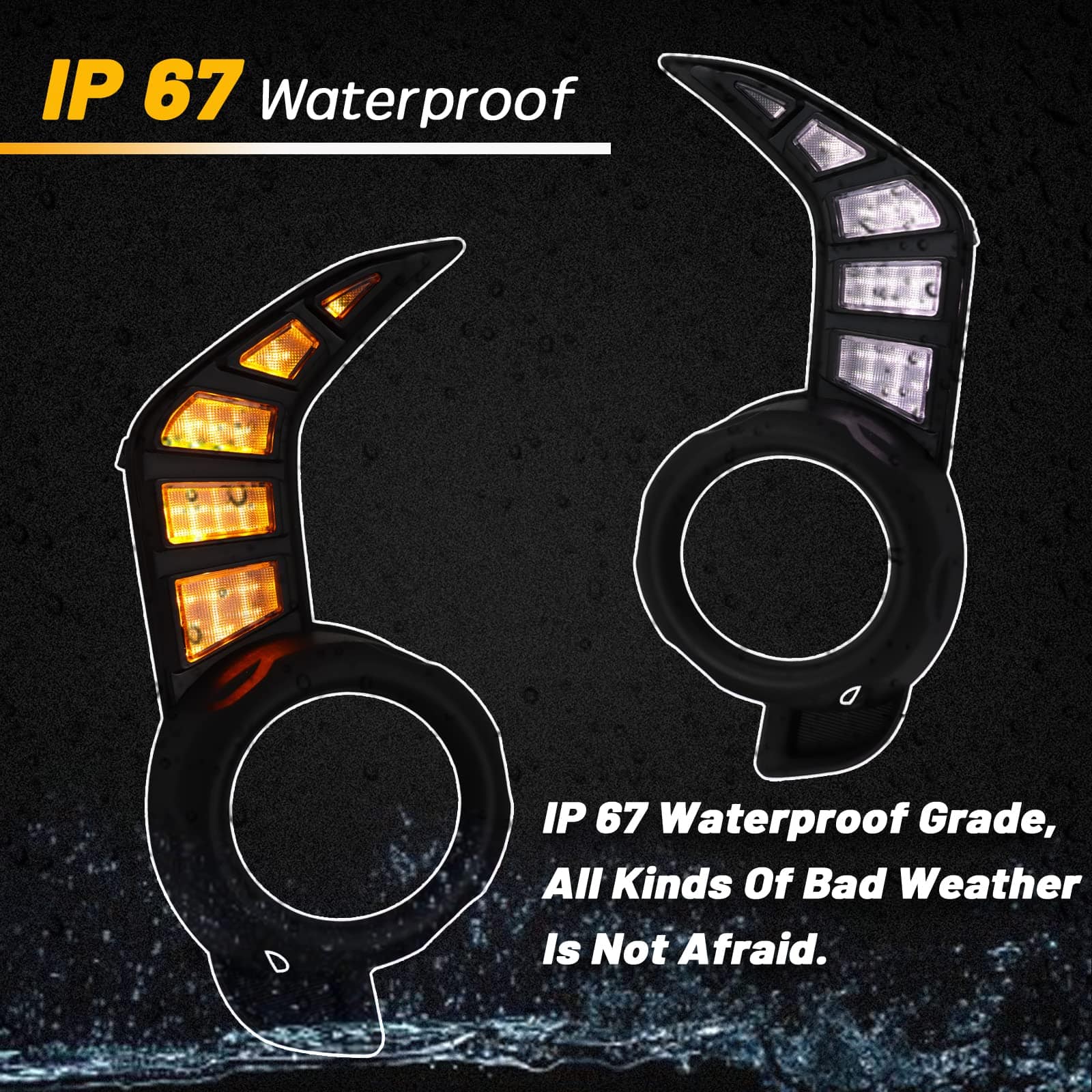 Visión General: Nuestro Kit de Luz de Circulación Diurna y Luz Antiniebla está hecho de ABS de alta calidad, LED de alta intensidad y lente de PMMA de alta calidad. Diseño único con carcasa no corrosiva y lente de alto impacto. ¡DRL + Señal de Giro TODO EN UNO! Las bombillas de luz LED CREE brindan una excelente transmisión de luz. Tecnología avanzada de corriente constante, luminiscencia bien distribuida. Actualice su vehículo para aumentar la seguridad y durabilidad. ¡Rode más seguro, vea mejor!