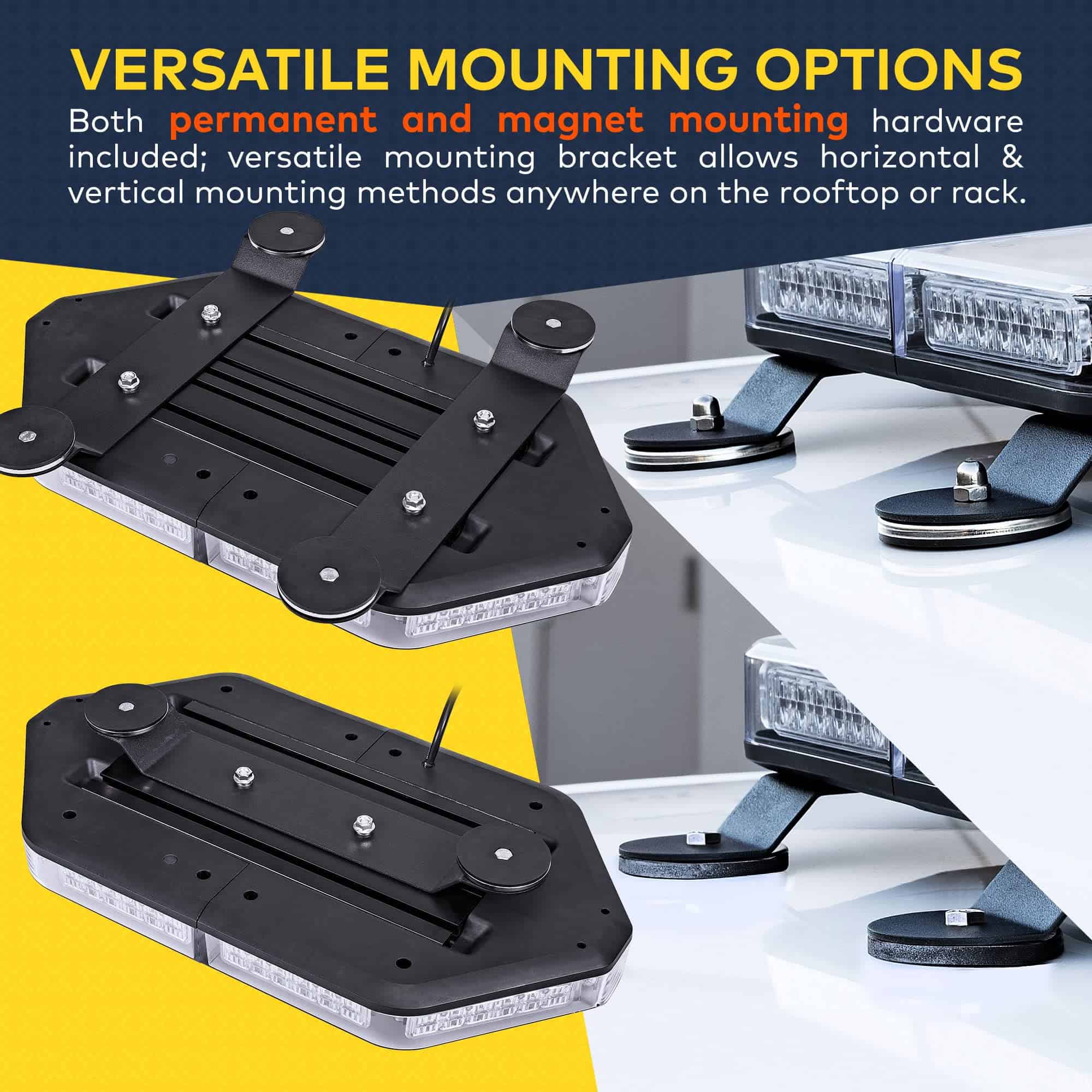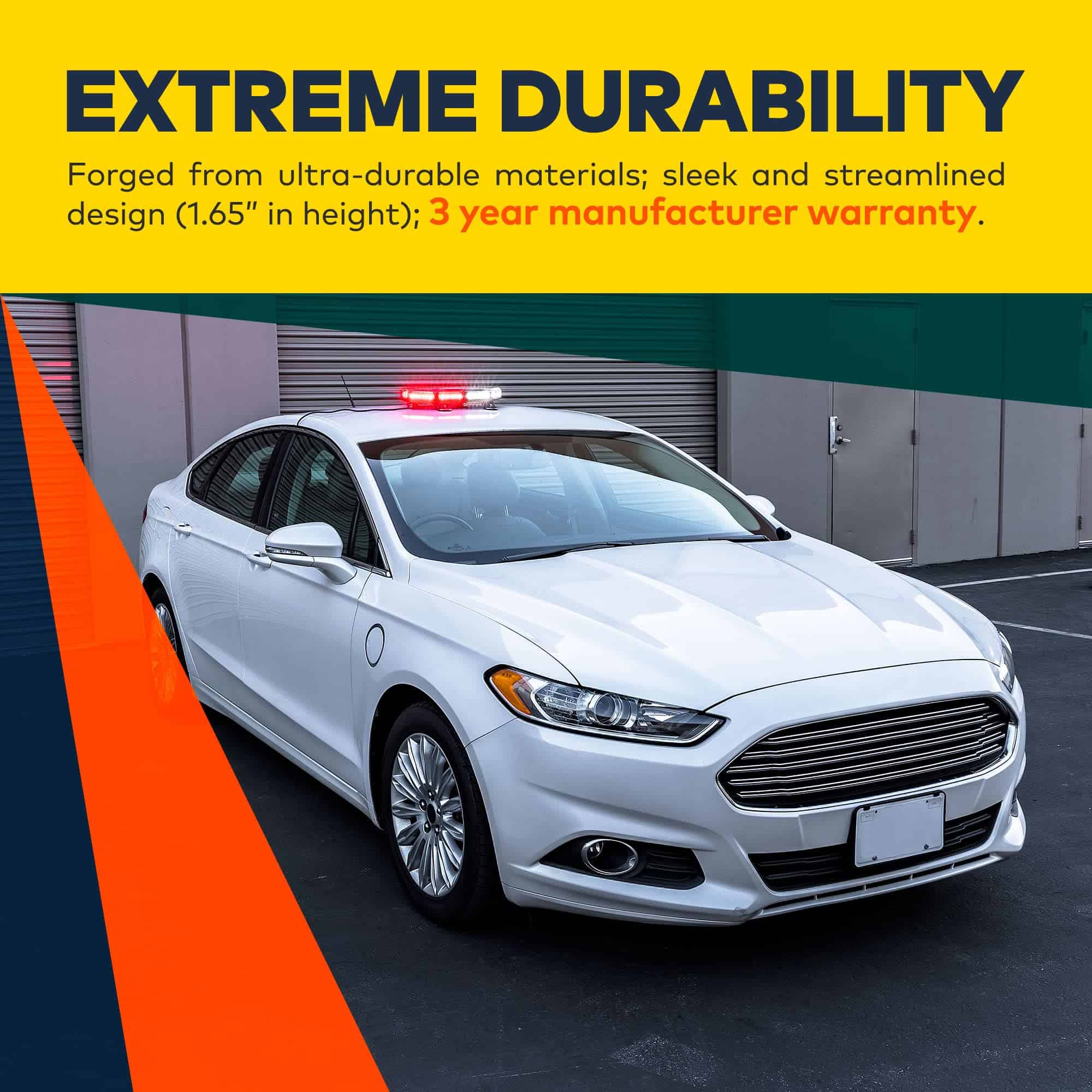 4. OPCIONES DE MONTAJE VERSÁTILES – Incluye hardware de montaje permanente y magnético; soporte de montaje versátil permite métodos de montaje horizontal y vertical en cualquier lugar del techo o la parrilla; barra de luces perfecta para sedanes de tamaño completo como los Crown Victorias, Chargers y más.