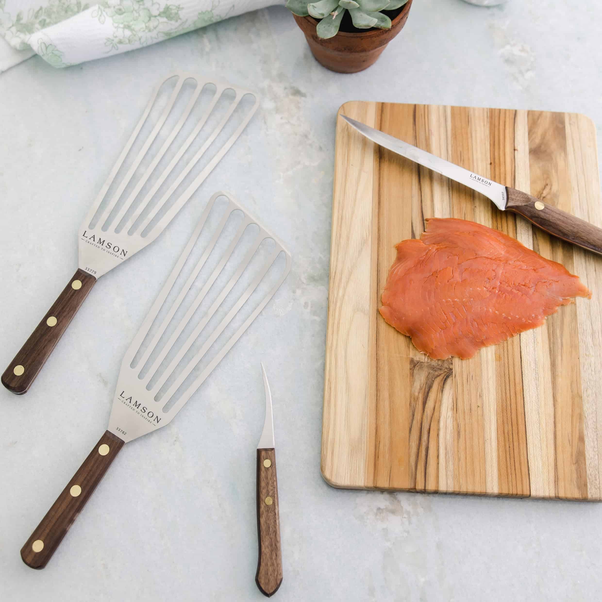 Los cuchillos, utensilios de cocina y herramientas comerciales de Lamson siguen siendo hechos a mano en Massachusetts por trabajadores estadounidenses. Estamos orgullosos de decir que después de 179 años, Lamson sigue produciendo los mejores cuchillos, utensilios de cocina y herramientas comerciales hechos en América que buscan la perfección. Lamson fue establecido en Shelburne Falls, Massachusetts en 1837. Como uno de los fabricantes de cuchillos más antiguos de Estados Unidos, Lamson ha sido la elección de cocineros caseros y profesionales, así como de presidentes de los Estados Unidos durante los últimos 179 años debido a su alto estándar de artesanía. Estas tradiciones son ciertas hoy en día no solo en nuestros cuchillos y utensilios de cocina, sino también en nuestro equipo de barbacoa, productos TreeSpirit (Utensilios de cocina de madera dura hechos a mano de América del Norte) y HotSpot (Agarraderas de silicona de grado profesional, Trivets, HotHandles).