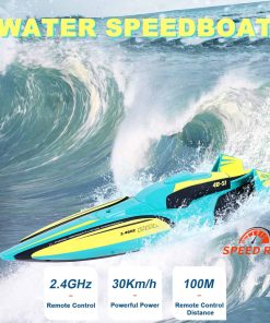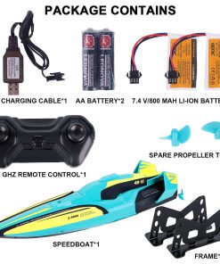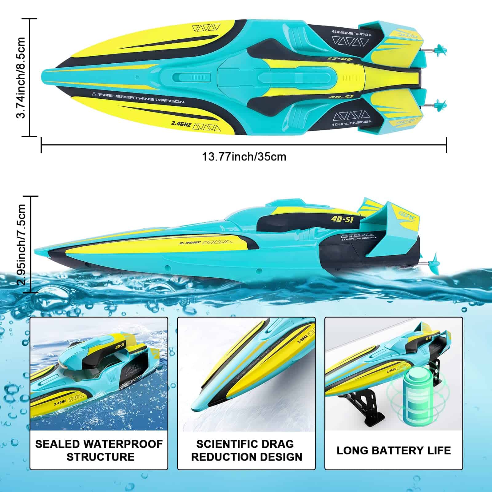 Lancha de Control Remoto Berry President 18MPH para Niños y Adultos, a Prueba de Agua y con Doble Motor, Barco RC Inalámbrico 2.4G para Piscinas y Lagos. Esta lancha de control remoto de alta velocidad está diseñada con doble remo y doble motor para hacerla firme y estable. Su velocidad es de hasta 18 mph. Cuenta con un control remoto anti-interferencias de 2.4G, que puede ser controlado dentro de un rango de aproximadamente 100 metros. Tiene una forma de casco novedosa, que es muy característica. Puede deslizarse libremente en tanques de agua, piscinas y lagos. El kit de lancha incluye un barco de control remoto de 13 pulgadas, un control remoto, un cable de carga USB, dos baterías de litio recargables de 7.4 voltios, dos baterías número 5, dos soportes de secado y dos hélices adicionales. El barco puede deslizarse con una batería totalmente cargada durante 35 minutos, lo que lleva una hora recargar. Cuando se excede la distancia o la batería está baja, el juguete de control remoto emitirá una alarma inteligente. Prevenir la pérdida de la lancha. El casco de la lancha está completamente sellado, evitando eficazmente que el agua se filtre en la cabina. El botón de control remoto es simple en diseño y fácil de controlar. Incluso si navega a gran velocidad por la noche, podrá identificar su posición y dirección en el lago. Ya sea de día o de noche, adultos y niños pueden jugar sin preocupaciones. Este juguete de control remoto está hecho de materiales ABS de alta calidad seguros y respetuosos con el medio ambiente. Es una opción ideal para todos los amantes de yates, motocicletas, aviones a reacción y yates para el ocio y el entretenimiento, fiestas infantiles, regalos de cumpleaños, regalos de Navidad o reuniones familiares. Este es el regalo perfecto para niños y adultos. Se convertirá en uno de los juguetes acuáticos más populares para niños.