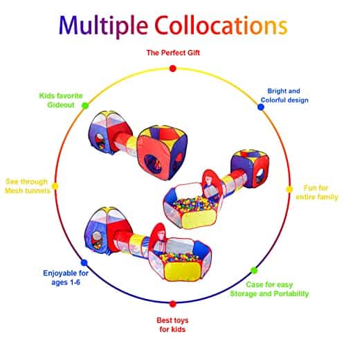 El crecimiento de los niños es un proceso lleno de curiosidad. Y el tiempo de juego es un aspecto crucial de esto. Las aventuras en este fuerte para niños, túnel para bebés y piscina de bolas pueden no solo ayudar a desarrollar habilidades críticas de los niños, incluyendo habilidades motoras, coordinación mano-ojo, habilidad cognitiva. Sino que también mejora la imaginación y creatividad en cualquier momento. Permita que los niños pasen un tiempo significativo y divertido con las tiendas de juegos para niños en el interior. Varios formas de jugar: Cada componente de la tienda de túnel para niños se puede usar juntos o por separado. Tienda emergente para niños: No hay pasos de ensamblaje complicados, solo ensambla en unos segundos. Zona de juego cómoda: El diseño de malla de la tienda fuerte, túnel emergente y la piscina de bolas para bebés ayuda a la circulación del aire y mantiene la transpirabilidad. Material de calidad premium: Tela suave y gruesa, duradera y fácil de mantener limpia. Ligero y portátil: Fácil de configurar y plegar, viene con una bolsa con cremallera para un almacenamiento conveniente. Uso en Interiores y Exteriores: Las tiendas para niños pueden llevarse de picnic, al patio trasero, al parque o simplemente mantenlas en la sala de juegos en casa. Tiempo de juego divertido: Escondiéndose, gateando, saltando y retirándose en la tienda para bebés, tus hijos disfrutarán de horas de diversión con el área de juegos al aire libre. Gran elección de regalo: Recomendado para regalos de niños de 3 años o juguetes para exteriores. Lo que hay Dentro del Paquete 2 x Túnel de Gateo 1 x Tienda de Piscina de Bolas 1 x Tienda Fuerte 1 x Tienda de Cubo 1 x Bolsa de Transporte 1 x Instrucciones