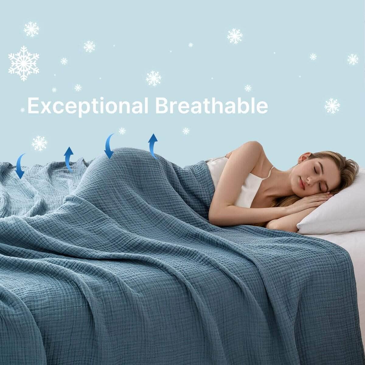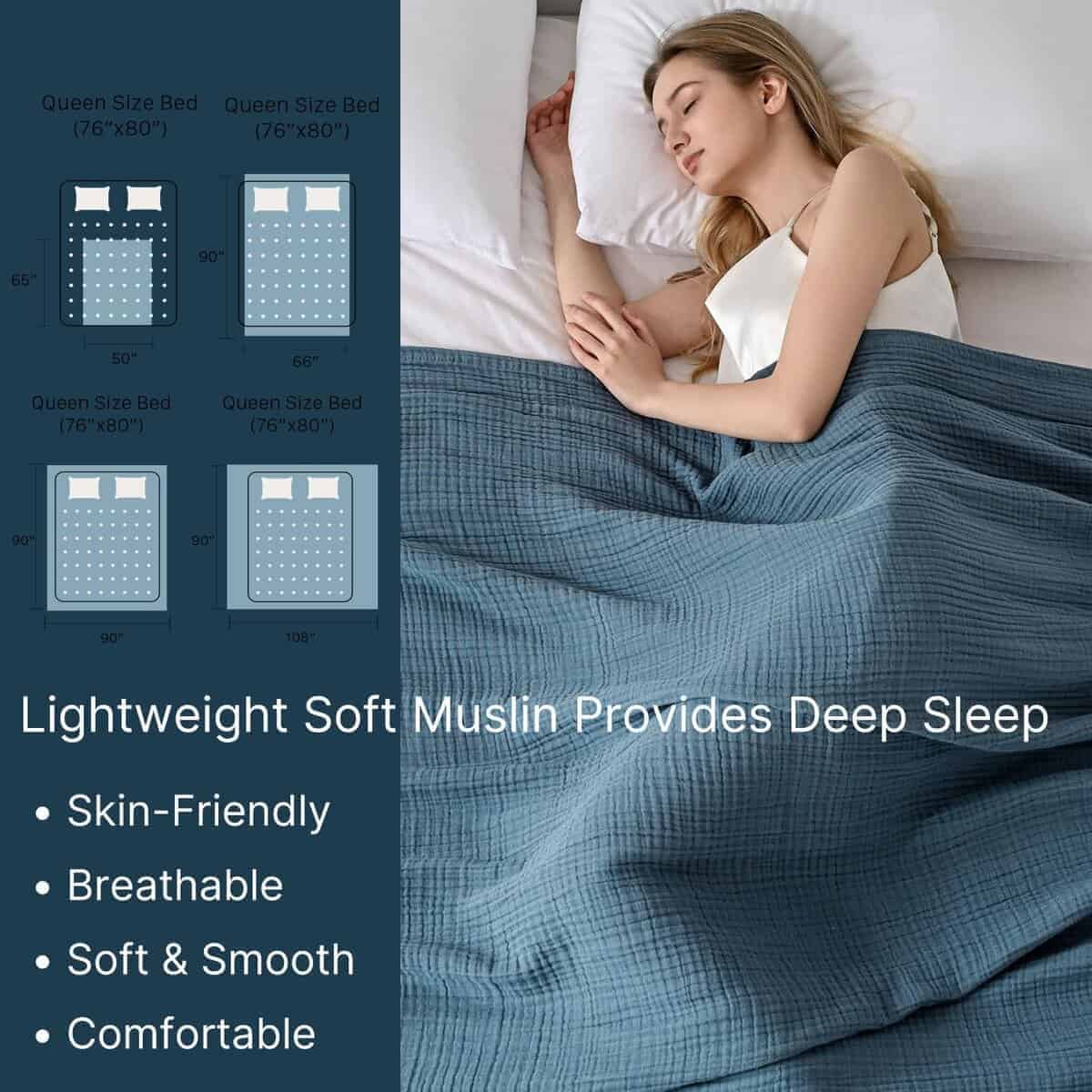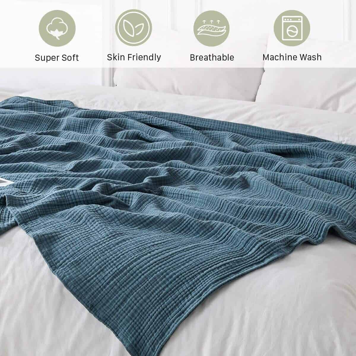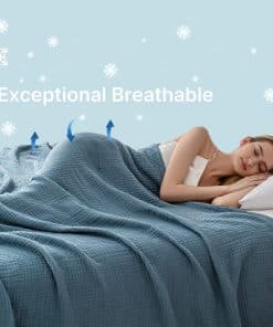 2. Transpirable y Absorción de Humedad: Diseñada para un confort máximo, nuestra manta de muselina destaca por su transpirabilidad y absorción de humedad, manteniéndote fresco y sin sudor. La muselina de algodón ligero proporciona la cantidad justa de calor sin calentarse en exceso, convirtiéndola en la compañera perfecta para aquellas personas que duermen calientes o noches de verano calurosas.