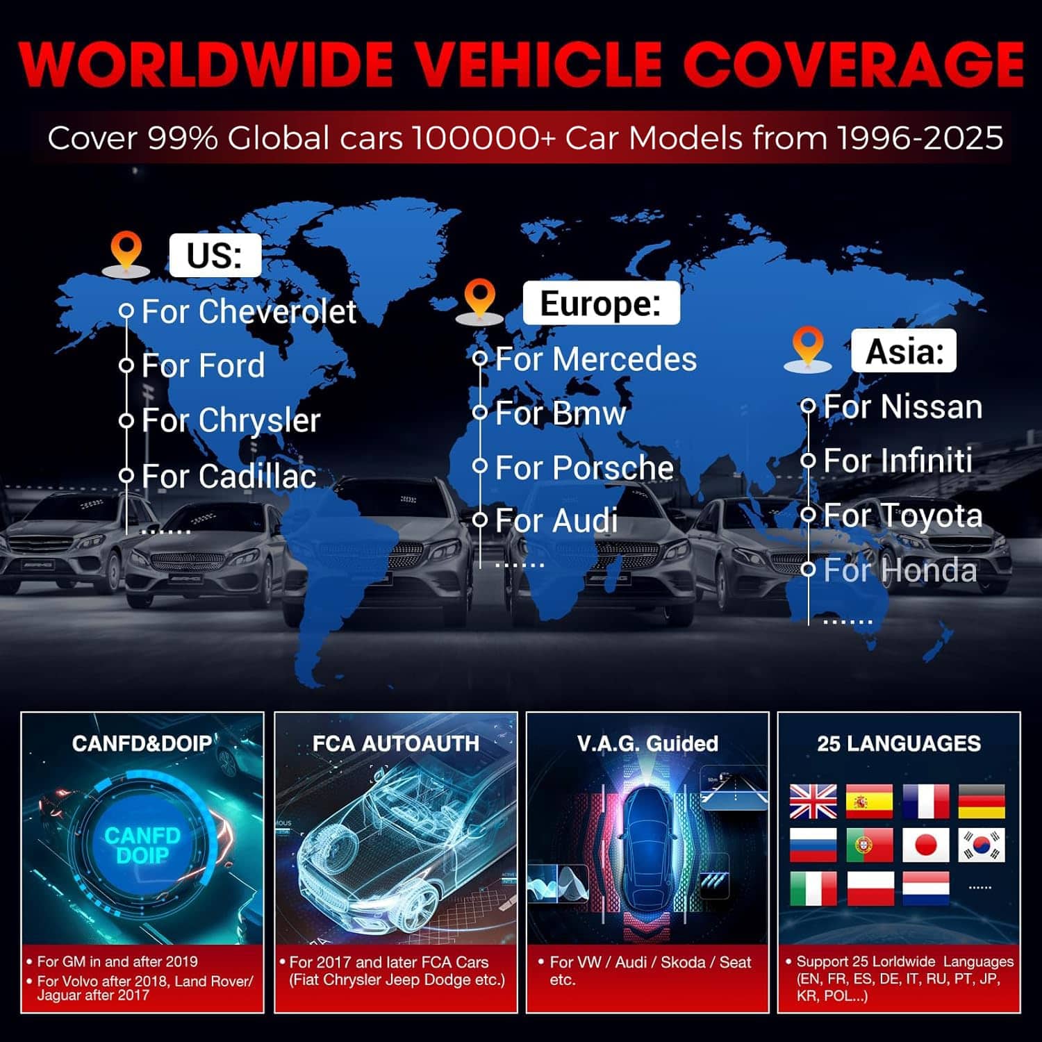 7. AMPLIA COBERTURA DE VEHÍCULOS SIN LÍMITE DE IP X431 PRO ELITE funciona para más de 200 marcas, más de 200,000 vehículos con Protocolos Completos CAN/DOIP/CAN FD/KWP, etc. El protocolo CANFD es adecuado para modelos G-M (2020 en adelante), el protocolo DOIP es adecuado para B-MW (chasis F&G), V-olvo(2018 en adelante), L-and Rover&J-aguar (2017 en adelante). El Acceso F.C.A AutoAuth es adecuado para C-hrysler/J-EEP/D-odge/F-iat/R-enault (2018 en adelante) sin necesidad de adaptadores para realizar diagnósticos y bidireccionales. Funciona para sedanes de 12V, camionetas ligeras, SUVs, minivans. El escáner de lanzamiento te ayuda a ganar más negocios.