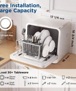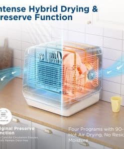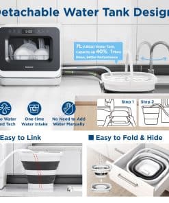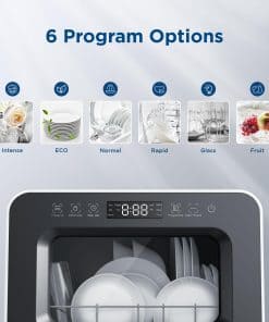 Este lavavajillas portátil de encimera combina lavado, secado y funciones de conservación en un solo electrodoméstico, ofreciendo un cuidado completo y poderoso para tu vajilla. Cuenta con un diseño desmontable revolucionario con función automática de entrada de agua, eliminando la necesidad de llenado manual. El cubo de agua portátil y plegable mejora la conveniencia de almacenamiento, haciendo que su uso sea sin esfuerzo. Incluye un tanque de agua desmontable de 7L, un 40% más grande que los modelos estándar, que agrega 1 ciclo de enjuague y mejora la limpieza en un 100%. ¡No se requiere configuración complicada! Este compacto lavavajillas portátil puede alojar más de 30 juegos de vajilla, incluyendo platos de hasta 10 1/4 pulgadas. Es perfecto para apartamentos, dormitorios, RV y camping. Ofrece 6 programas (Intenso, Eco, Normal, Rápido, Cristal, Frutas) para satisfacer diversas necesidades de lavado, proporcionando flexibilidad y limpieza a fondo para diferentes tipos de platos. En los programas Intenso, Normal, Rápido y Cristal, el lavavajillas activa el secado con aire caliente durante aproximadamente 90 minutos, asegurando que todos los platos estén completamente secos sin dejar humedad residual. Después de lavar, se ejecuta una función de conservación con ventilación continua del ventilador cada 3 horas durante 18 minutos dentro de las 24 horas, asegurando que los utensilios permanezcan sin olores y frescos. Logra una limpieza excepcional con temperaturas de agua de hasta 192°F, haciéndolo perfecto para desinfectar artículos para bebés y más. Con dimensiones de 16″ D x 17 1/4″ W x 16 3/4 H, este lavavajillas portátil de encimera es compacto pero espacioso, encajando fácilmente en cualquier espacio de cocina.