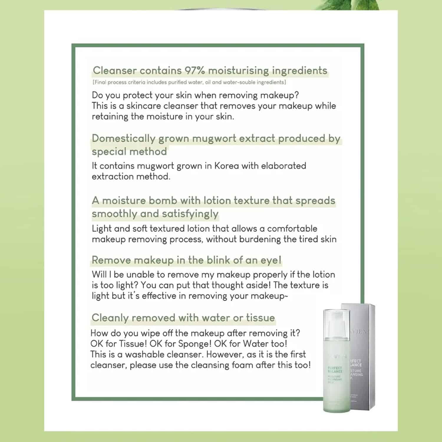 LAVIEN Perfect Balance Moisture Cleansing Milk es la respuesta a tus necesidades de limpieza facial diaria. Con extracto de artemisa coreana y 7 ingredientes naturales, este limpiador facial hidratante calma tu piel sensible mientras elimina suavemente la suciedad y las impurezas. Su fórmula no irritante mantiene el equilibrio natural de hidratación de tu piel, haciéndolo perfecto para uso diario. Este suave limpiador lechoso es ideal para eliminar el maquillaje, incluidos los productos a prueba de agua más difíciles. Su aplicación suave descompone eficazmente el maquillaje mientras nutre la piel, dejándola limpia y refrescada. Además, es adecuado para todo tipo de piel, ya sea seca, grasa, mixta o sensible. Su fórmula pH balanceado asegura que respete el estado natural de tu piel, convirtiéndolo en una opción confiable para toda la familia. Disfruta de una limpieza refrescante en cualquier momento del día con esta leche facial revitalizante. Simplemente aplica sobre la piel húmeda, masajea suavemente y enjuaga para una experiencia de limpieza lujosa que se adapta perfectamente a tu rutina diaria.