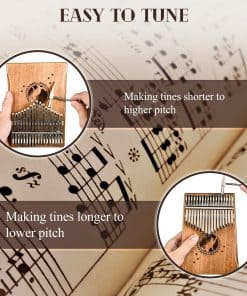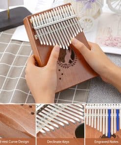 Descripción: Kalimba, también conocido como thumb piano o mbira, es un instrumento musical único que puede emitir un sonido limpio y resonante similar al arpa. Este Kalimba de LEKATO cuenta con hermosos patrones tallados en su cuerpo de Caoba de alta calidad, que no solo son agradables a la vista sino también suaves al tacto. Las 17 teclas del instrumento están hechas de acero mineral de primera calidad, que no se oxida fácilmente y produce un timbre claro y duradero. El diseño ergonómico del piano de pulgar hace que sea cómodo de tocar, con teclas flexibles grabadas con notas que son amigables para los principiantes. Además, incluye una bolsa de tela para transportarlo fácilmente y poder disfrutar de la música en cualquier momento y lugar. El Kalimba es perfecto tanto para principiantes como para profesionales, ya que proporciona folletos de autoestudio que permiten a cualquier persona, incluso sin experiencia musical, aprender a tocar hermosas melodías. Tocar el Kalimba no solo brinda placer auditivo, sino que también ayuda a desarrollar la flexibilidad y coordinación de los dedos, fomentando así el talento musical. Un regalo ideal para amantes de la música y para la educación musical temprana.
