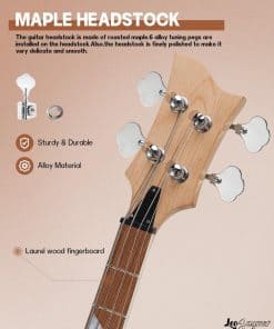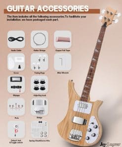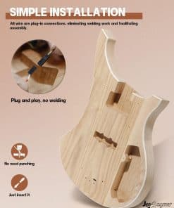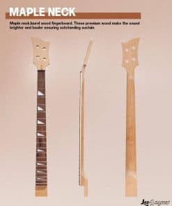 Leo Jaymz Kits de Bajo Eléctrico DIY con cuerpo de ceniza tostada y un elegante diseño RB. El kit incluye un mátisl de arce tostado, diapasón de madera de laurel y 20 trastes con inlays triangulares que le dan un aspecto único. La pala moldeada cuenta con cuatro agujeros para las clavijas y los controles y herrajes de color Cromo Brillante completan su elegante apariencia. Todos los componentes, hardware y cables necesarios están incluidos en el kit. Además, la posibilidad de pegar papel de lámina de cobre en ciertas partes para reducir el ruido, junto con los cables enchufables, hacen que el ensamblaje sea sencillo y sin complicaciones. ¡Conviértete en un experto en la construcción de tu propio bajo eléctrico con Leo Jaymz!