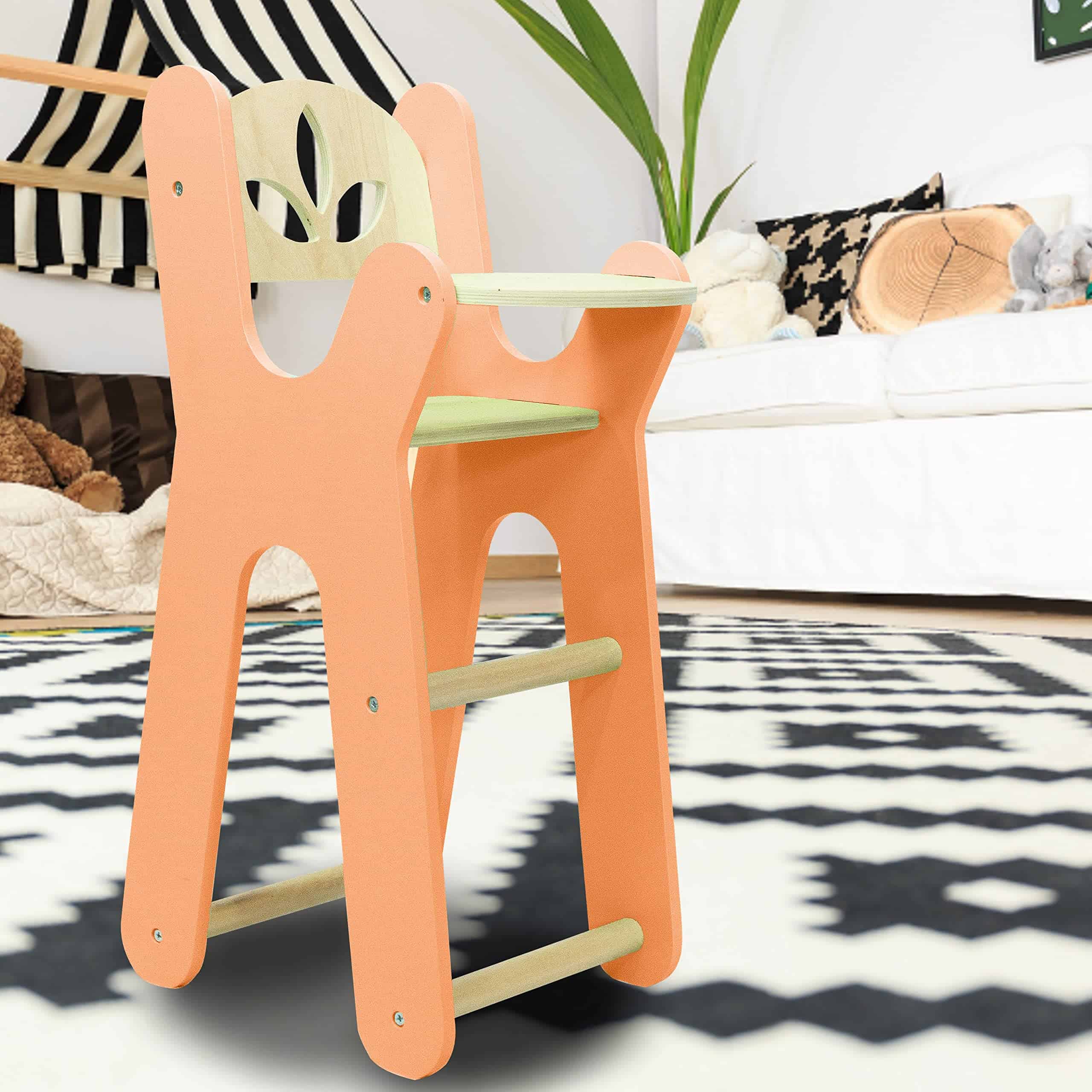 Esta adorable silla alta naranja se convertirá en el juguete favorito de tu niño pequeño. Tu hijo puede colocar su osito de peluche favorito, muñeca o juguete de peluche en el asiento y jugar a la casa. Los juguetes de madera dan a los niños un respiro de sus pantallas de televisión y iPads. Se anima a los pequeños a ser creativos y usar su imaginación. Nuestros juguetes de madera escandinavos son reconocidos por su simplicidad, durabilidad, minimalismo y funcionalidad. Nuestros hermosos diseños gender neutral están diseñados para durar y son queridos por niños y padres de todo el mundo. Ensamblaje rápido y fácil: ¡Nuestros juguetes de madera tardan aproximadamente 10 minutos en ensamblarse con herramientas incluidas! Puedes estar seguro de que nuestros juguetes de madera eliminarán el estrés del ensamblaje de juguetes con nuestras instrucciones fáciles de seguir. Tu niño estará listo y listo para jugar con su nuevo juguete favorito en poco tiempo. Este juguete sería un regalo ideal para un baby shower, cumpleaños, guardería, salón de clases y fiestas. Nuestros juguetes confiables están diseñados para ir a donde vaya tu pequeño y crecerán con tu hijo. Deja que nuestros juguetes creen nuevos recuerdos para tu hijo hoy.