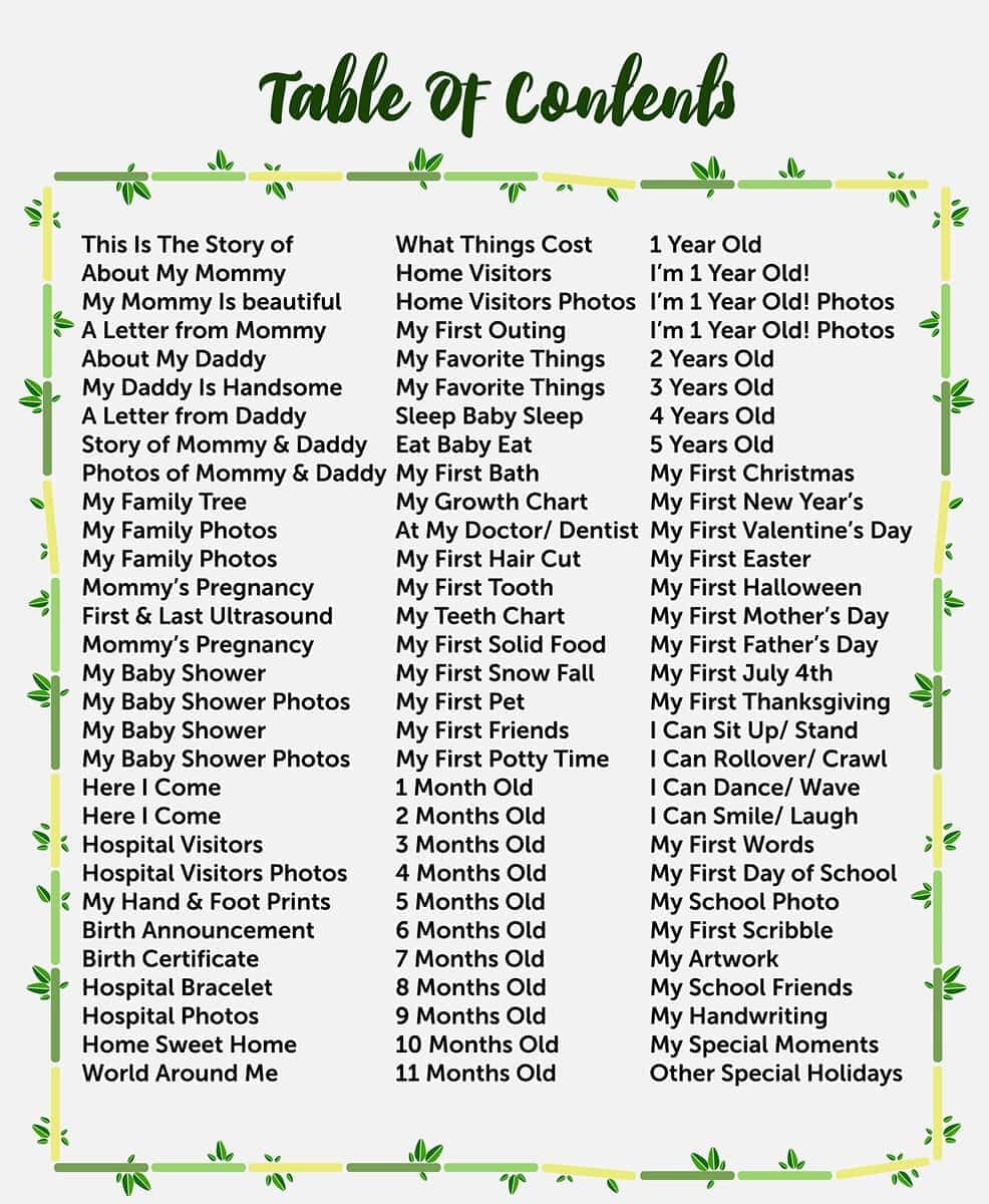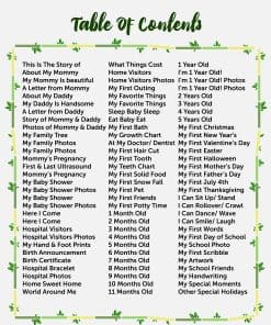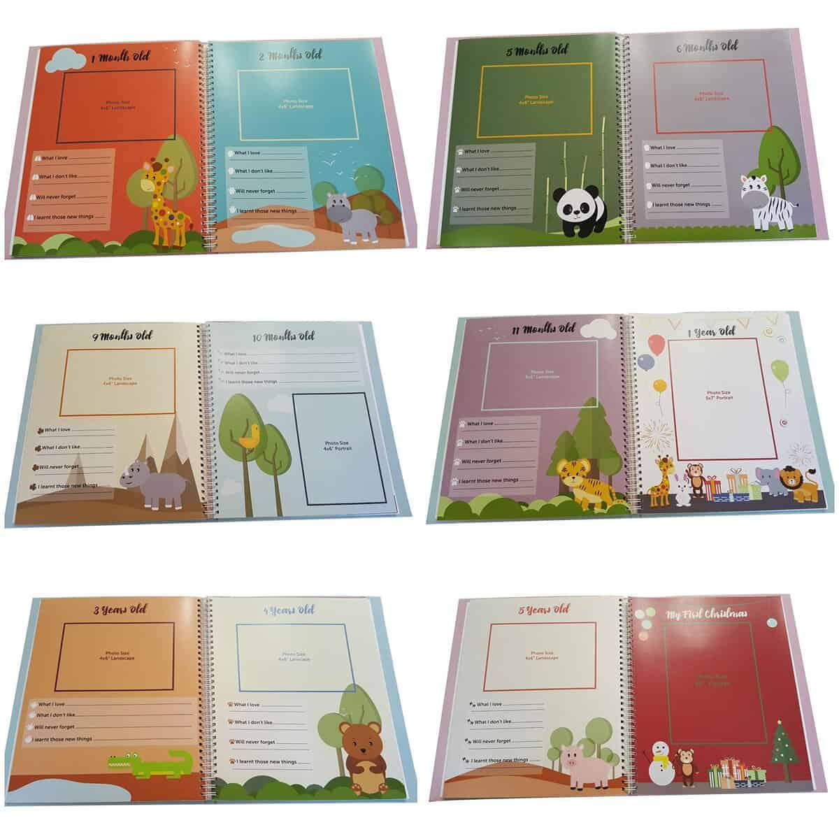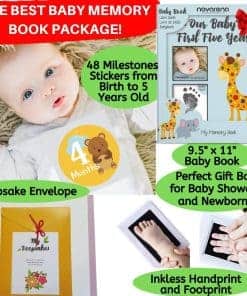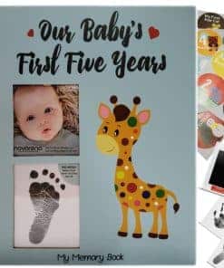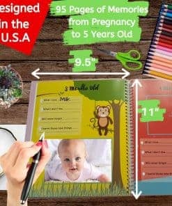 Recuerde los primeros 5 años de su bebé para siempre con este álbum de fotos con temática de jungla. Este álbum de 95 páginas es el libro de memoria completo desde el diario de embarazo hasta los 5 años de edad. Nuestros libros de 9″-11″ para bebés tienen animales de la selva y la granja en cada página, perfectos como regalos de baby shower, regalos para niñas y regalos para niños. Incluye una almohadilla de tinta segura para bebés, 48 pegatinas, un sobre y una caja de recuerdos para guardar los recuerdos del bebé. También incluye un árbol genealógico, diario de embarazo neutral en cuanto al género, marco para imagen de ultrasonido, notas y cartas al bebé, libro de visita de baby shower, páginas para cuando llega el bebé incluyendo espacio para el kit de huellas y manos del bebé, meses del bebé y páginas y pegatinas de cumpleaños de 1 a 5 años, primeras vacaciones y páginas en blanco adornadas.
