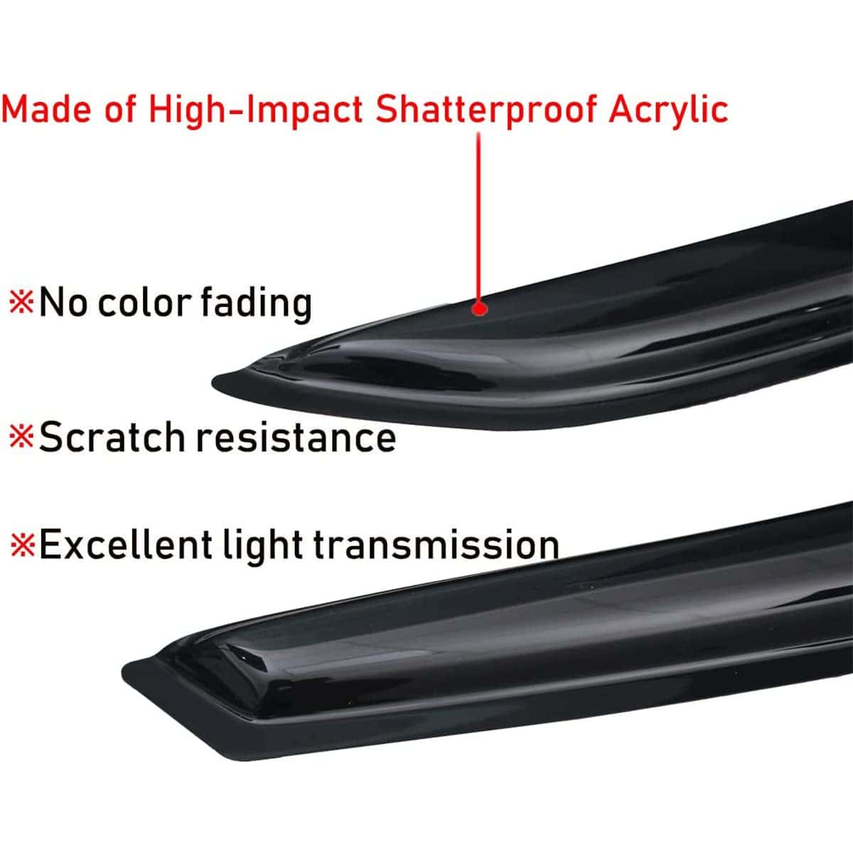 Los visores de ventana están diseñados para los propietarios de automóviles que aman el aire fresco natural con el A/C apagado y las ventanas entreabiertas en los días soleados. También ayudan a los automóviles con A/C ineficiente a mantener la circulación de aire fresco, libre de aire viciado y empañamiento de parabrisas/ventanas en días lluviosos o cualquier condición climática. Estos deflectores de ventanas laterales ayudan a reducir la temperatura de la cabina del automóvil, cuando se estaciona al sol con las ventanas parcialmente abiertas. Los protectores de lluvia no son guardias de seguridad, pero bloquean los rayos UV, viento, humedad, insectos y otros escombros para ingresar a la cabina del automóvil, para proteger al conductor y a los pasajeros. Ayudan a reducir la exposición al sol y el deslumbramiento al conducir.