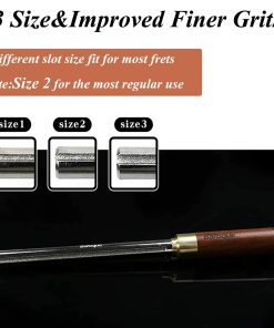 3. Tamaño 3 en 1: La lima tiene 3 surcos de diferentes tamaños. El surco pequeño se utiliza para diapasones de Ukulele. El surco mediano se utiliza para diapasones normales de guitarra/bajo, que se usan de forma regular. El surco grande se utiliza para diapasones jumbo.