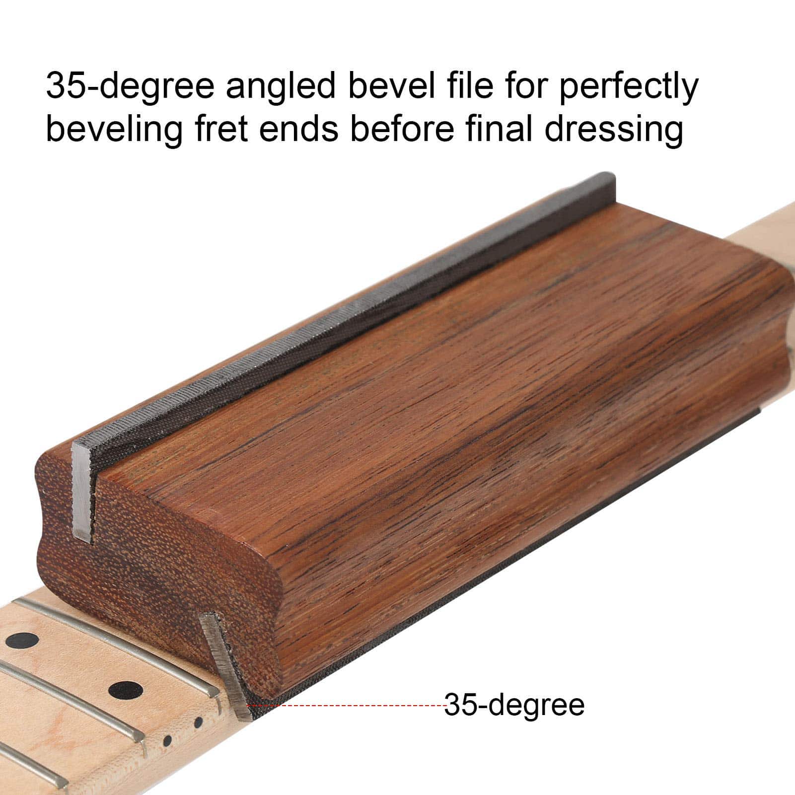 4. Lima biselada de 35 grados Utilice la lima biselada de 35 grados para biselar perfectamente los extremos de los trastes antes del vestido final.