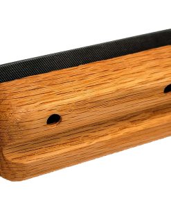 Esta es una herramienta hermosa, distintiva y extremadamente útil para terminar tus trabajos de trastes en guitarras, bajos, banjos y otros instrumentos con trastes. Esta herramienta de lima para biselar dará a tus extremos de trastes un bisel uniforme de 35 grados, dándoles ese aspecto profesional terminado y (con un suavizado y pulido adicional adecuado) haciéndolos mucho más fáciles en las manos del músico. La longitud de esta herramienta y lima es de 4 3/4″, un tamaño perfecto para instrumentos grandes y pequeños. La lima está ajustada a un ángulo de 35 grados y se mantiene en su lugar con tornillos hexagonales, para que pueda ser reemplazada si es necesario. Todos los bordes están cuidadosamente redondeados para la comodidad del usuario, y en los lados se han enrutado surcos redondeados para ayudar con el agarre. Los bordes de la lima también están cuidadosamente redondeados y suavizados para que no enganchen en los extremos de los trastes.