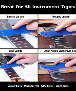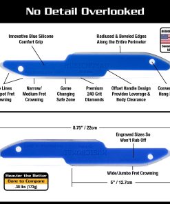 4. GRAN MEJORA SOBRE LOS DISEÑOS DE MANGO EXISTENTES: Nuestro cómodo, pesado y ergonómico diseño de mango hace una gran diferencia. Comienza con nuestro innovador agarre de silicona azul que reduce la fatiga de la mano. El diseño con desplazamiento proporciona tanto palanca adicional al limar como te permite limpiar el cuerpo de la guitarra al limar sobre él. El peso hace la diferencia. Reforzamos nuestro diseño para que el peso del Archivo S haga el trabajo por ti y se encuentre en una clase de peso aparte en .38 libras (173g). Por último, la aplicación del tamaño de traste del canal está grabada en el mango para que no se borre, lo que te permite saber el tamaño de archivo correcto para usar. Incluso incluimos un conveniente agujero para colgar.