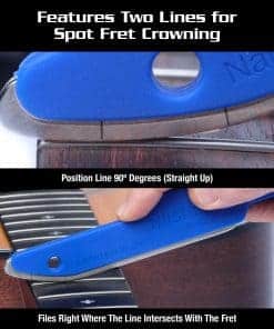 5. CARACTERÍSTICAS Y BENEFICIOS ADICIONALES: Funciona increíblemente para emparejar el material de traste más popular y ampliamente utilizado, el Níquel Plata, que se encuentra en todas las Guitarras Acústicas, Banjos, Ukuleles y la mayoría de las Guitarras Eléctricas y Bajos. Como con cualquier archivo, usarlo en alambres de traste de Acero Inoxidable acortará la vida útil del archivo. El Acero Inoxidable se usa en un pequeño porcentaje de Guitarras Eléctricas y Bajos. Nuestro exclusivo diseño de nariz presenta dos líneas para emparejar trastes puntuales. Coloca la línea para que esté a 90 grados de los trastes y estarás limando justo donde la línea se cruza con el traste. Nuestro proceso de fabricación de alta calidad incluye bordes redondeados y biselados a lo largo de todo el perímetro.