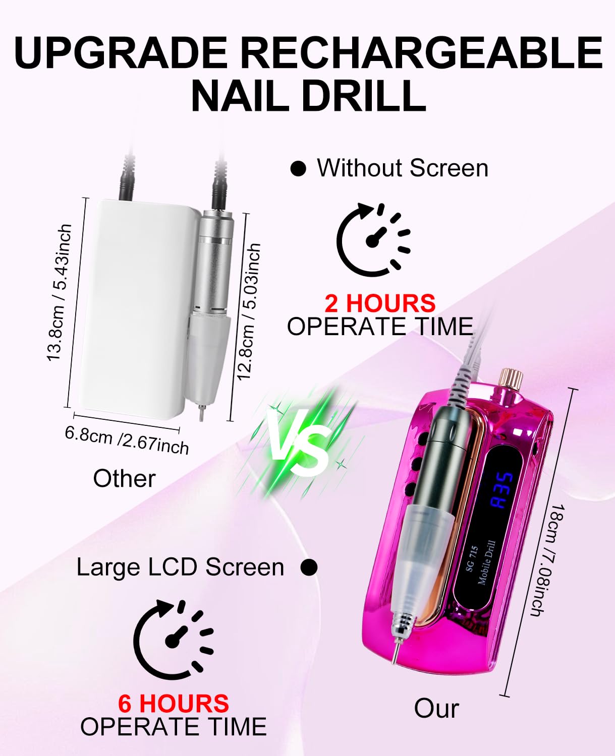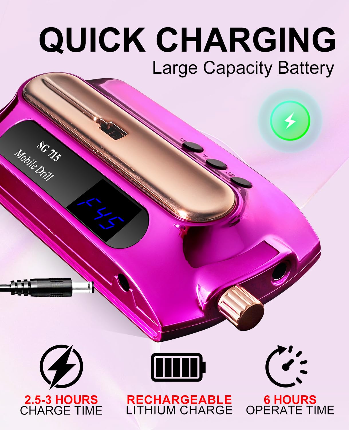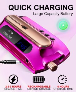 2. Potente – lima de uñas inalámbrica, puede funcionar hasta 6-8 horas con cada carga completa, y el nivel de batería restante se mostrará en la pantalla LCD cuando presiones el botón P. La máquina de limado de uñas cuenta con un botón de control de velocidad ajustable (0-45000rpm), y rotación en dirección hacia adelante / hacia atrás para usuarios diestros y zurdos, lo que hace que sea muy conveniente ajustar la velocidad y recordarte la carga.