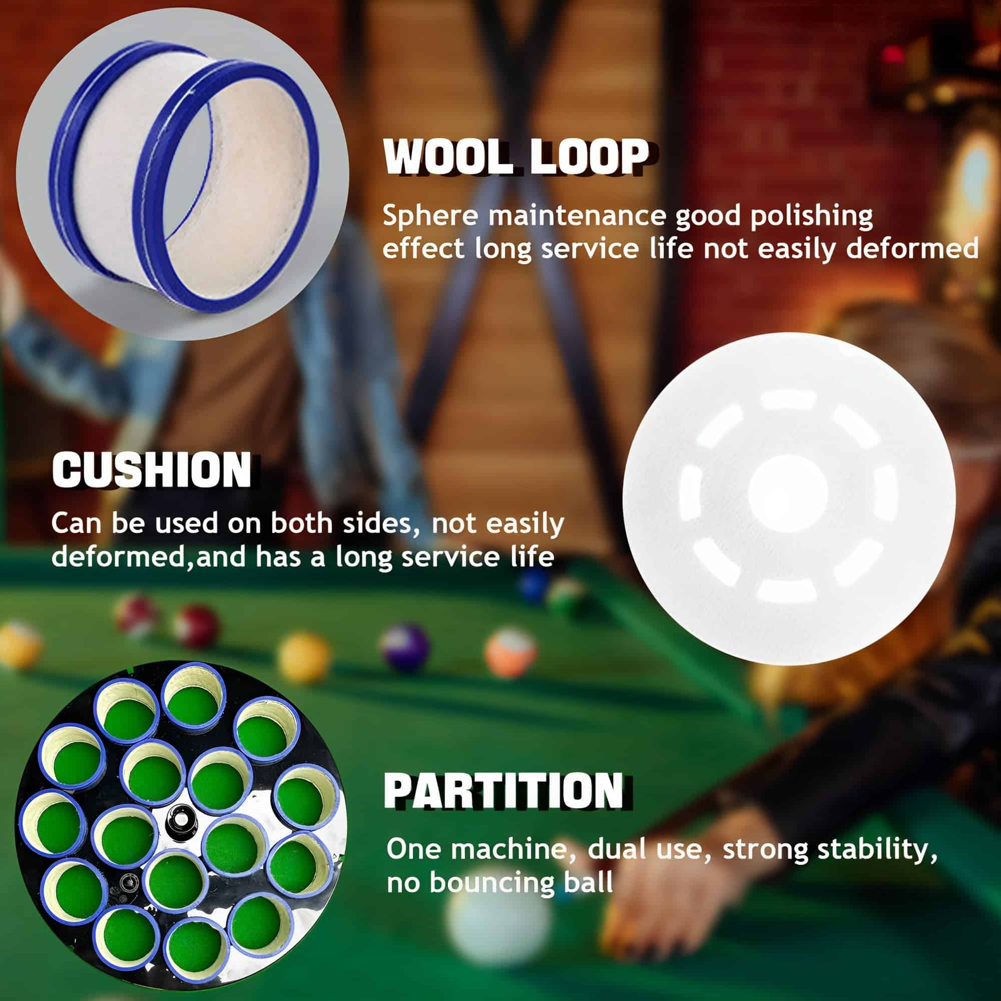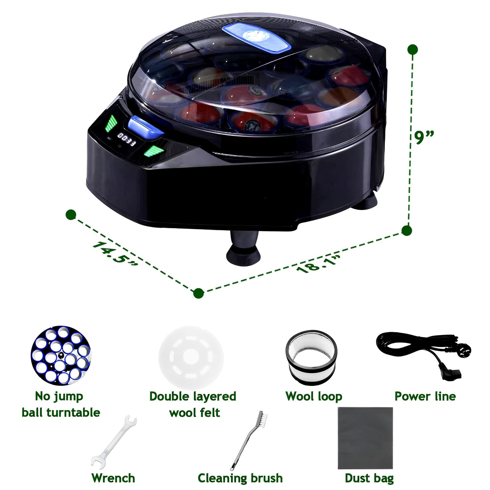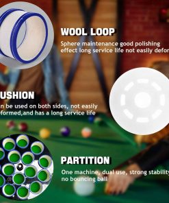 4. Materiales de Alta Calidad: La placa de bolas cuenta con anillos de lana de alta calidad que ofrecen resultados excepcionales en el pulido y garantizan un mantenimiento efectivo de las bolas de billar. Para limpiar el bucle sucio, utilice el cepillo de hierro incluido. Tenga en cuenta que el bucle de lana no se puede lavar. Tenga en cuenta que, debido a restricciones de envío, la máquina no incluye spray de pulido.