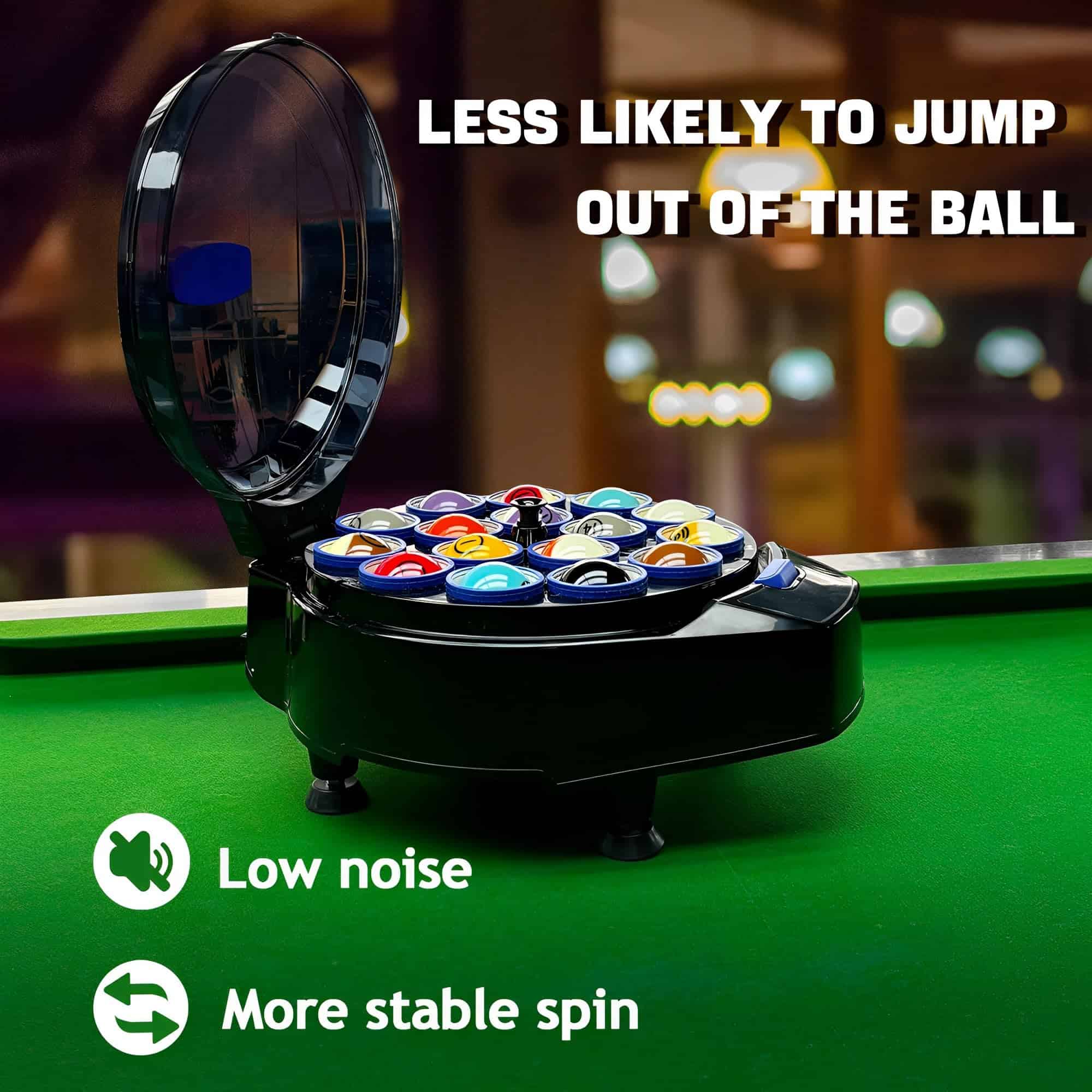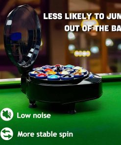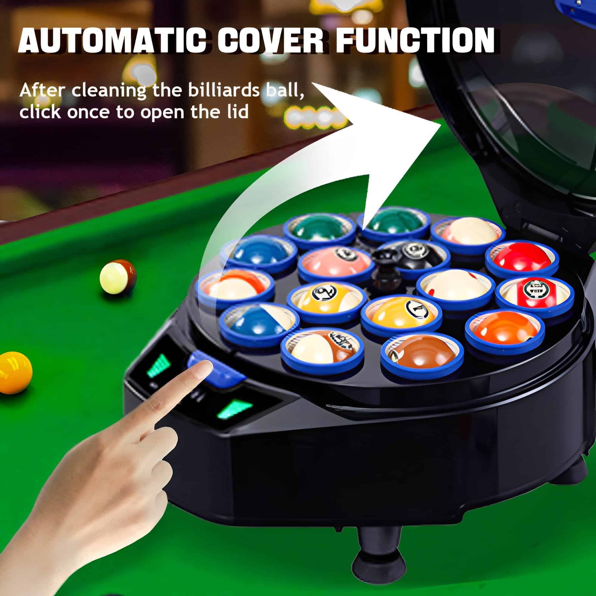 2. Limpieza Automática de Bolas: Simplemente presione el botón de la tapa para abrir automáticamente la cubierta de la máquina de limpieza de bolas de billar automática. Coloque las bolas de billar dentro y cierre la tapa para iniciar el proceso de lavado de las bolas, que se ejecuta automáticamente y se completa en menos de 3 minutos para la máxima comodidad y rapidez.