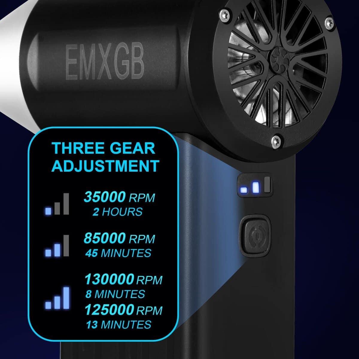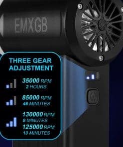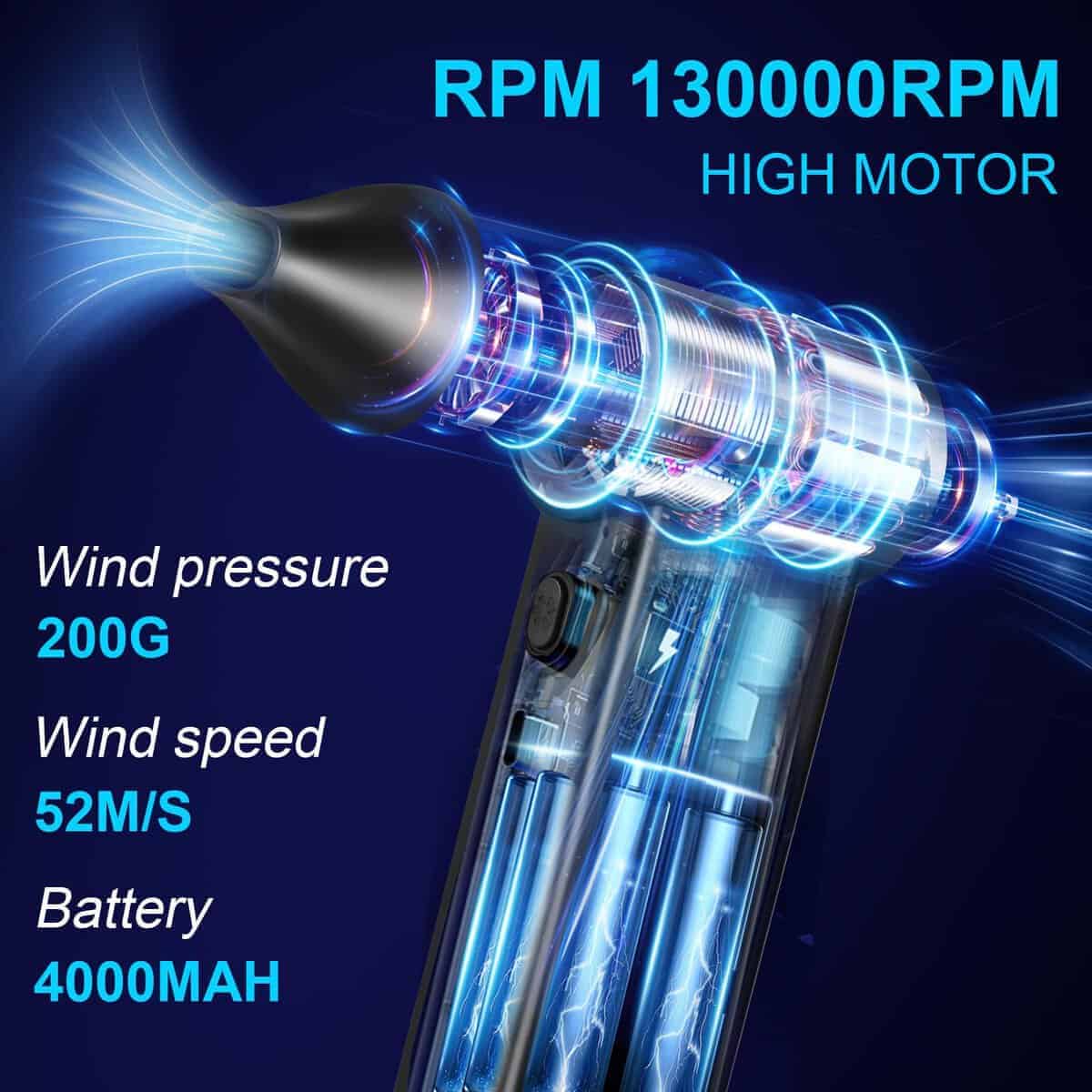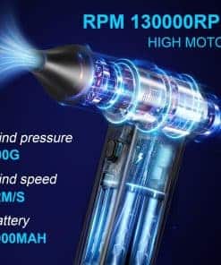1. Ventilador turbo: Motor de alta velocidad super 130000 RPM: Este soplador de aire comprimido alcanza una velocidad máxima de 130000 RPM, presión de viento de 200 G, velocidad máxima de viento superior a 52 m/s, el ventilador turbo elimina fácilmente la suciedad escondida en varios huecos del teclado u otros dispositivos electrónicos.