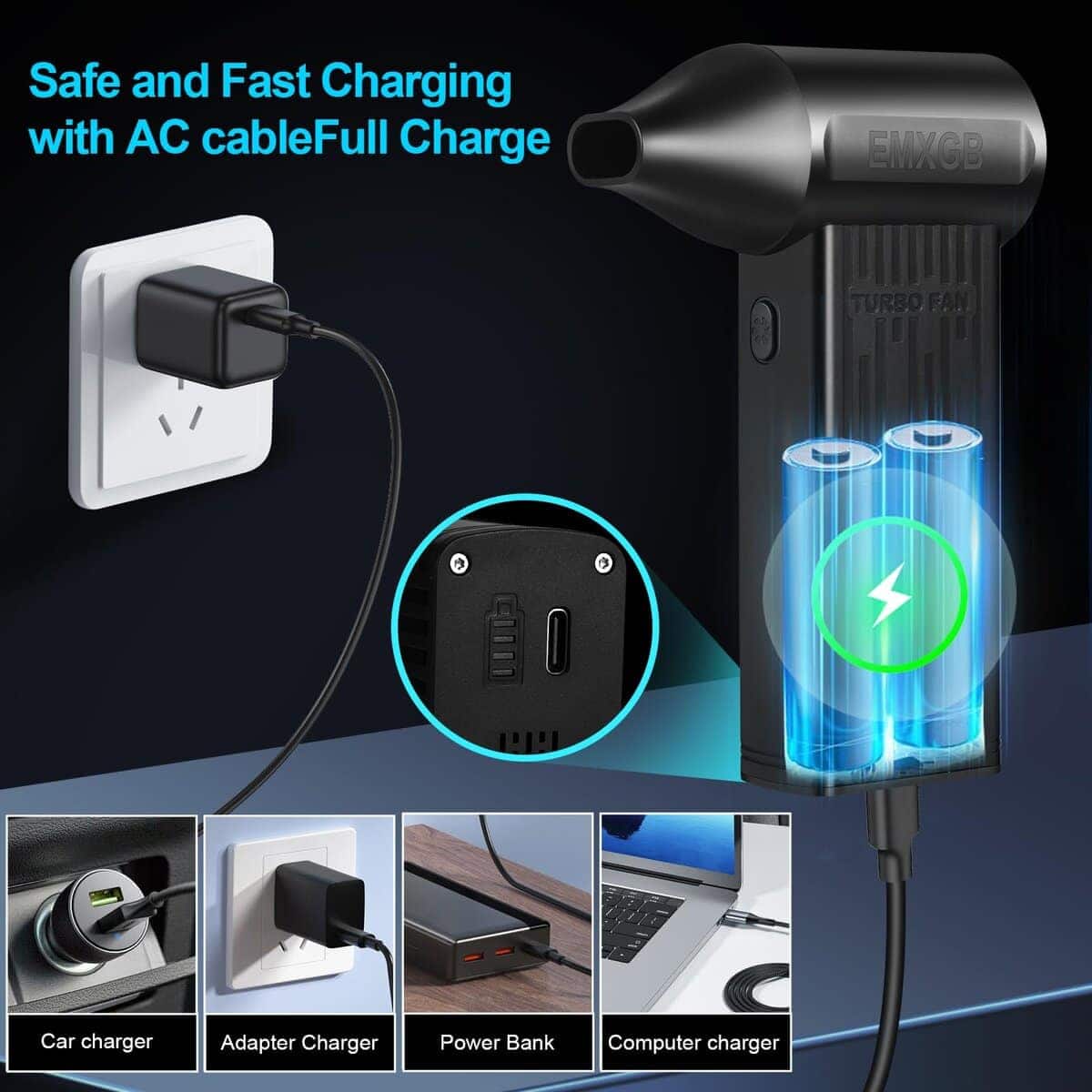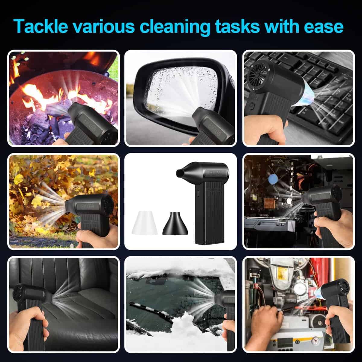 2. Multiuso: el limpiador de aire comprimido es una herramienta versátil, como kit de limpieza de teclado, soplador de hojas eléctrico, suministros para detallado de coches, limpiador de PC, soplador de nieve, ventilador turbo, secador de coche, escoba de aire, etc. Este soplador de aire es fácil de limpiar teclados y limpiar coches, asientos, persianas, cámaras, limpieza de PC, etc. El ventilador turbo incluso puede inflar camas hinchables, hacer fuego, limpiar el suelo, limpiar el pelo de mascotas.