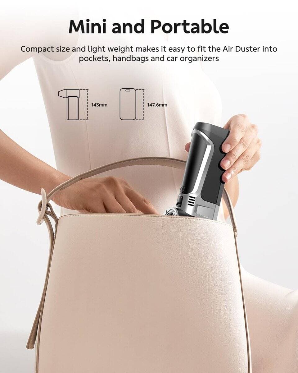 Este Limpiador de Aire Comprimido eléctrico presenta una velocidad máxima impresionante de 160,000 RPM, lo que lo convierte en la herramienta perfecta para eliminar el polvo y la suciedad de lugares de difícil acceso como teclados, torres de computadora y otros dispositivos electrónicos delicados. Viene equipado con múltiples boquillas y cepillos suaves de limpieza para garantizar una limpieza completa sin causar daños a tus dispositivos. Además de su uso para electrónicos, este soplador de aire también es versátil y multiuso, ya que puedes utilizarlo para despejar hojas, polvo o incluso nieve de tu automóvil. También es ideal para aumentar el flujo de aire a tu carbón de barbacoa, mejorando su eficiencia. Con un diseño recargable y reutilizable, este soplador de aire es una alternativa ecológica a los cilindros de aire comprimido desechables, ahorrándote dinero a largo plazo. Su uso no produce líquido ni escarcha, garantizando que tu equipo permanezca seguro y seco durante la limpieza. Con tres ajustes de velocidad y una carga rápida gracias al cable Tipo-C incluido, puedes seleccionar el flujo de aire perfecto para diferentes tareas de limpieza y recargarlo por completo en solo 3 horas. Este mini soplador inalámbrico está diseñado pensando en la comodidad, con un agarre ergonómico que facilita su manejo durante un uso prolongado. Su construcción ligera y compacta te permite llevarlo a cualquier lugar de forma sencilla, incluso guardarlo en tu bolsillo para tener una limpieza potente siempre a mano.