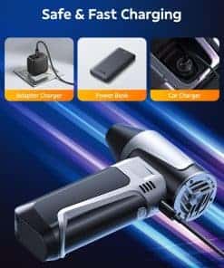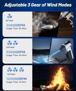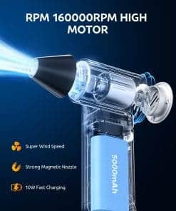 1. Potente Limpiador de Aire Comprimido: Este soplador de aire eléctrico cuenta con una impresionante velocidad máxima de 160,000 RPM, lo que lo hace perfecto para eliminar el polvo y residuos de lugares difíciles de alcanzar como teclados y dispositivos electrónicos delicados como torres de computadora. Viene con varios boquillas y cepillos suaves de limpieza para garantizar una limpieza completa sin dañar tus dispositivos.