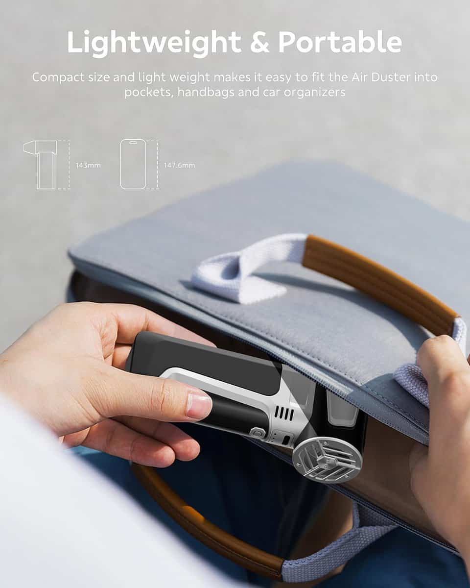 5. Ligero y Portátil: Diseñado pensando en la ergonomía, este mini soplador inalámbrico ofrece un agarre cómodo, haciéndolo fácil de manejar durante un uso prolongado. Su construcción compacta y ligera significa que puedes llevarlo sin esfuerzo a cualquier lugar, incluso metiéndolo en tu bolsillo para que siempre tengas una limpieza potente en movimiento sin ocupar espacio adicional.