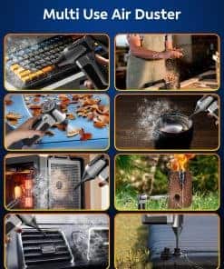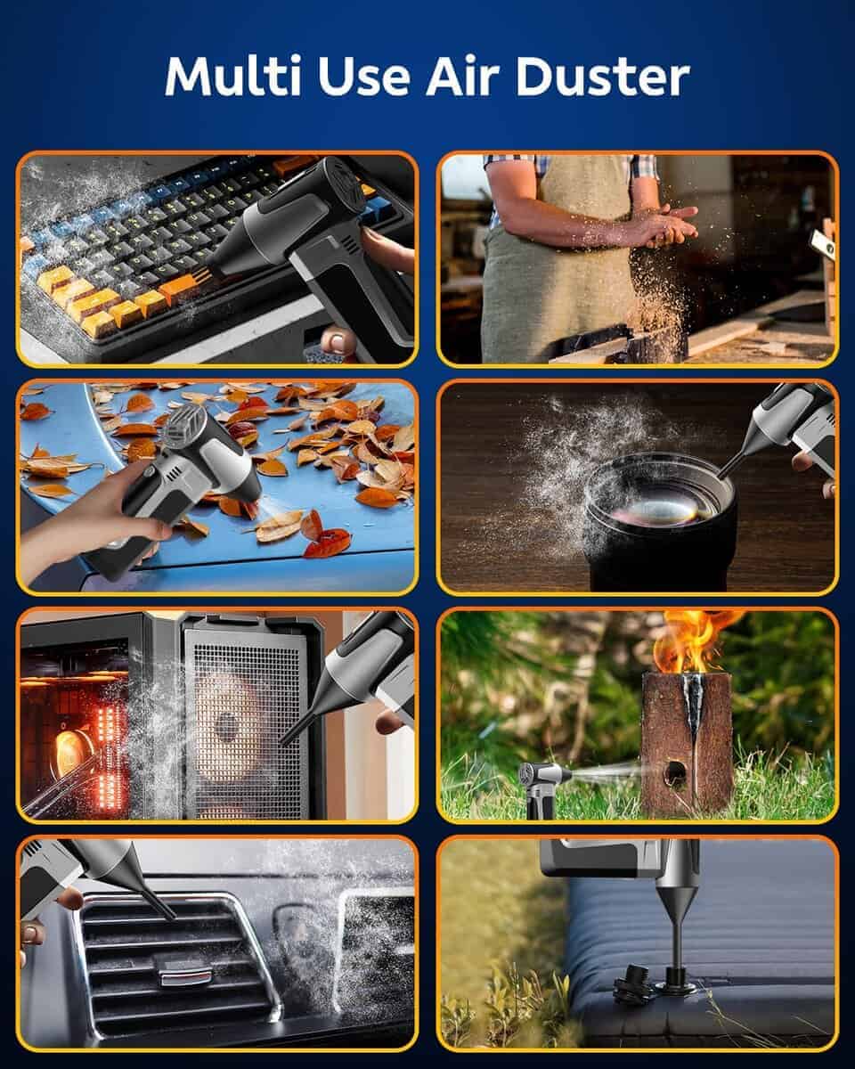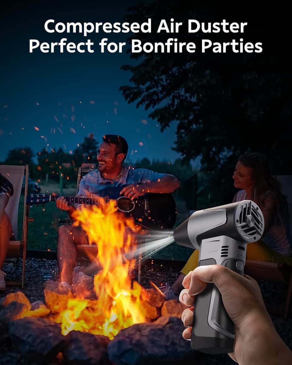 2. Uso Versátil y Multiuso: ¡El Limpiador de Aire Eléctrico CAMCAMP no es solo para electrónicos! Úsalo para despejar hojas, polvo, o incluso nieve ligera de tu auto. También es excelente para aumentar el flujo de aire a tu carbón de barbacoa, haciéndolo arder de manera más eficiente. Ya sea limpiando asientos de auto, sofás, impresoras, aires acondicionados o teclados, este potente soplador es la solución perfecta para abordar trabajos de limpieza pequeños y difíciles.