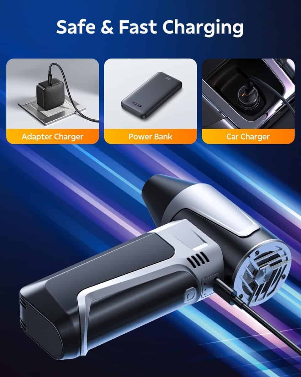 4. Tres Ajustes de Velocidad y Carga Rápida: Este soplador de aire cuenta con tres velocidades de viento ajustables, lo que te permite seleccionar el flujo de aire perfecto para diferentes tareas de limpieza. El diseño de boquilla magnética hace que sea rápido y sencillo cambiar los accesorios según sea necesario. Además, con el cable de carga rápida Tipo-C incluido, el dispositivo admite carga rápida de 10W, recargándose por completo en tan solo 3 horas para máxima comodidad.