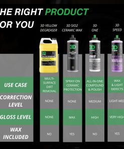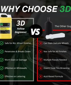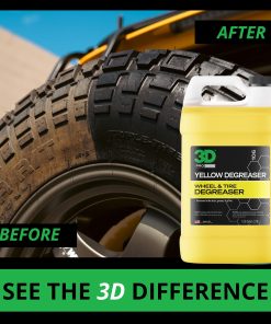 Limpiador de ruedas y neumáticos 3D Yellow Degreaser sin ácido para polvo de freno, suciedad y abrillantadores de neumáticos – Seguro para todas las ruedas y paredes blancas – 1 galón. El limpiador de ruedas y neumáticos 3D Yellow Degreaser descompone el polvo de freno obstinado, residuos de silicona, suciedad de carretera y mugre en los neumáticos sin dañar tus llantas o guardabarros. Su fórmula libre de ácido lo hace resistente al desorden pero seguro para todo tipo de acabados de ruedas cromadas, pintadas, pulidas y más. Los viejos abrillantadores de neumáticos y la suciedad acumulada no tienen oportunidad. Yellow Degreaser levanta todo, reviviendo los lados de goma y haciendo que las letras o paredes blancas vuelvan a resaltar. Es perfecto para limpiar a fondo los neumáticos descuidados antes de volver a aplicar tu abrillantador de neumáticos favorito. Formulado para disolver el vínculo aceitoso entre el polvo de freno metálico y tus ruedas, este desengrasante elimina rápidamente el desorden. No más frotar o preocuparse por la corrosión, solo rocía, agita, enjuaga y admira un acabado limpio, de nivel profesional cada vez. Mientras que la mayoría de los desengrasantes recortan esquinas, 3D Yellow Degreaser trae la limpieza sin ácidos fuertes ni toxinas. Es biodegradable, respetuoso con el medio ambiente y seguro para un uso repetido en tu coche, RV, motocicleta o incluso las ruedas y neumáticos de tu vehículo diario. Fabricado en EE. UU. por el equipo experto en I+D de 3D, esta fórmula está diseñada para ser la opción más segura y efectiva para el cuidado de las ruedas y neumáticos. Diseñado por detallistas que saben lo que funciona, te brinda esa limpieza profunda sin comprometer la calidad o la seguridad