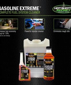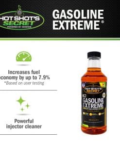 Limpiador de sistema de combustible concentrado Hot Shot’s Secret Gasoline Extreme 32 Oz para motores de gasolina – Aumenta el MPG y restaura el rendimiento del motor. Hot Shot’s Secret Gasoline Extreme está diseñado para limpiar, lubricar y proteger todos los componentes de un motor de gasolina y sistema de combustible, como válvulas, bombas, inyectores, anillos, pistones y cilindros superiores. Al limpiar a fondo el sistema de combustible, este aditivo aumenta el MPG hasta un 7.9%, garantiza la eficiencia de la combustión y la potencia del motor, lo que resulta en una experiencia de conducción más suave y eficiente. Este tratamiento de combustible aborda problemas comunes asociados con motores que funcionan de manera irregular en un solo tratamiento. Diseñado para mejorar la economía de combustible, suavizar el ralentí y desatascar los inyectores de com… (truncated)