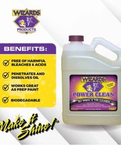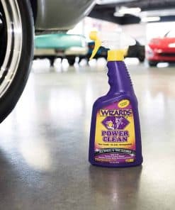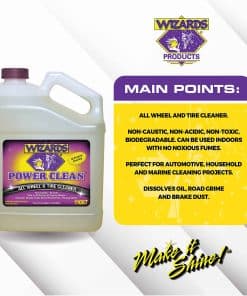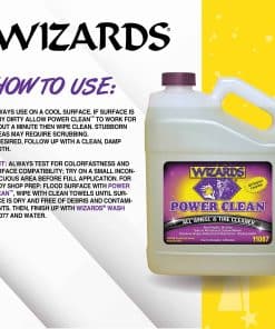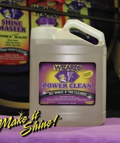 El Limpiador desengrasante multiusos Wizards 11087 Power Clean es ideal para disolver aceite, suciedad de la carretera y polvo de frenos. No es cáustico ni ácido, lo que lo hace seguro para ruedas altamente pulidas. También es eficaz para limpiar neumáticos y letras blancas elevadas y bandas blancas. Además, puede utilizarse como removedor de grasa, cera y silicona. Su fórmula especial lo hace seguro para usar en interiores, incluyendo tableros de instrumentos, asientos y pisos, siendo un eliminador de manchas super potente para alfombras.