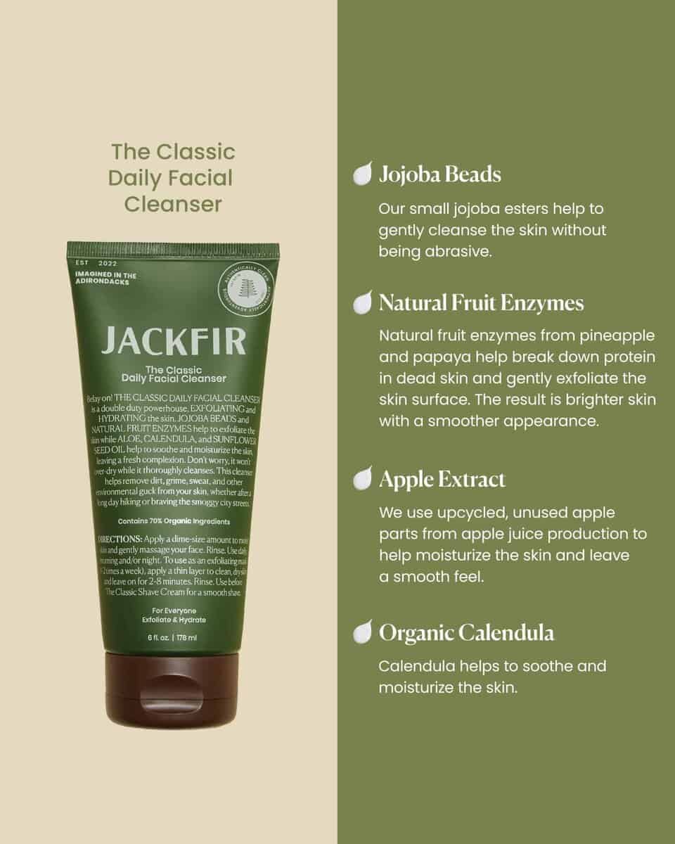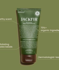 El Limpiador Facial Diario Clásico es una potente fórmula de doble acción que exfolia e hidrata la piel. Las perlas de jojoba y las enzimas naturales de frutas trabajan juntas para exfoliar suavemente la piel, eliminando las impurezas y las células muertas, mientras que el aloe, la caléndula y el aceite de semilla de girasol ayudan a calmar e hidratar la piel, dejando una tez fresca y radiante. Además, su aroma natural y terroso, compuesto solo por aceites esenciales, te transportará a un bosque tranquilo y relajante. Este limpiador facial ha sido orgullosamente verificado por EWG, Certificado Vegano y cruelty-free por Leaping Bunny. Con más del 70% de ingredientes orgánicos según los estándares de QAI, puedes confiar en que estás usando un producto de alta calidad y seguro para tu piel. Todas las fórmulas de Jackfir son sometidas a pruebas rigurosas por alergólogos y dermatólogos, garantizando su eficacia y seguridad. Además, la marca se compromete con la sostenibilidad, utilizando materiales reciclados en sus envases y cartones certificados por FSC. Fabricado en EE. UU. con ingredientes de origen nacional y global, el Limpiador Facial Diario Clásico Jackfir es la elección confiable de miles de hombres y mujeres para mantener una piel limpia y saludable.