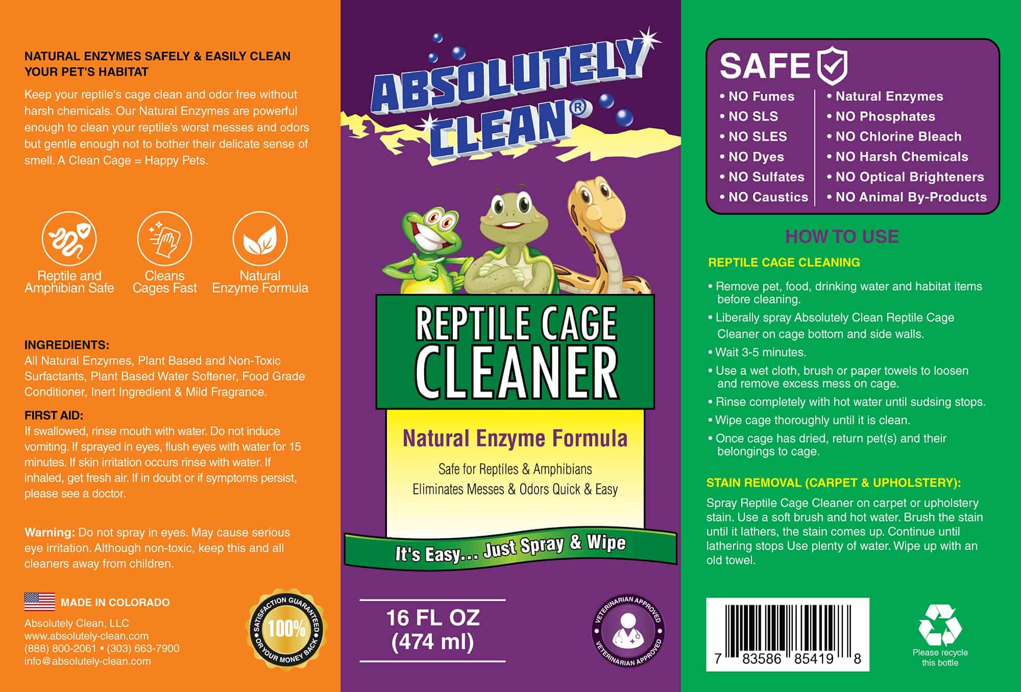 El Limpiador y eliminador de olores para terrarios de reptiles y anfibios Absolutely Clean Amazing utiliza el poder de limpieza de enzimas naturales para mantener limpio y sin olores el terrario o jaula de tus mascotas. Nuestras enzimas naturales son lo suficientemente poderosas para limpiar los peores desechos y olores de tus reptiles, pero lo suficientemente suaves para no molestar su delicado sentido del olfato. Pasa más tiempo disfrutando de tus mascotas exóticas y menos tiempo limpiando con el Limpiador y eliminador de olores para terrarios de reptiles y anfibios Absolutely Clean Amazing.