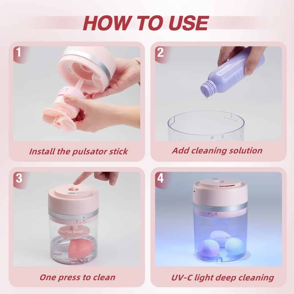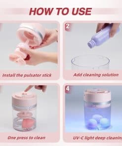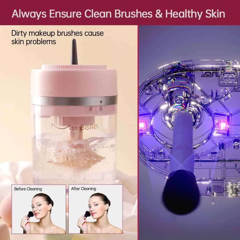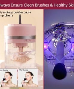 4. Limpieza profunda con luz UV-C Esta máquina de limpieza viene con luz UV-C, que elimina eficazmente cosméticos, químicos y otros residuos en las brochas de maquillaje, reduce los problemas de la piel. También puedes poner tus esponjas de maquillaje lavadas para utilizar la función de limpieza más profunda con luz UV-C.