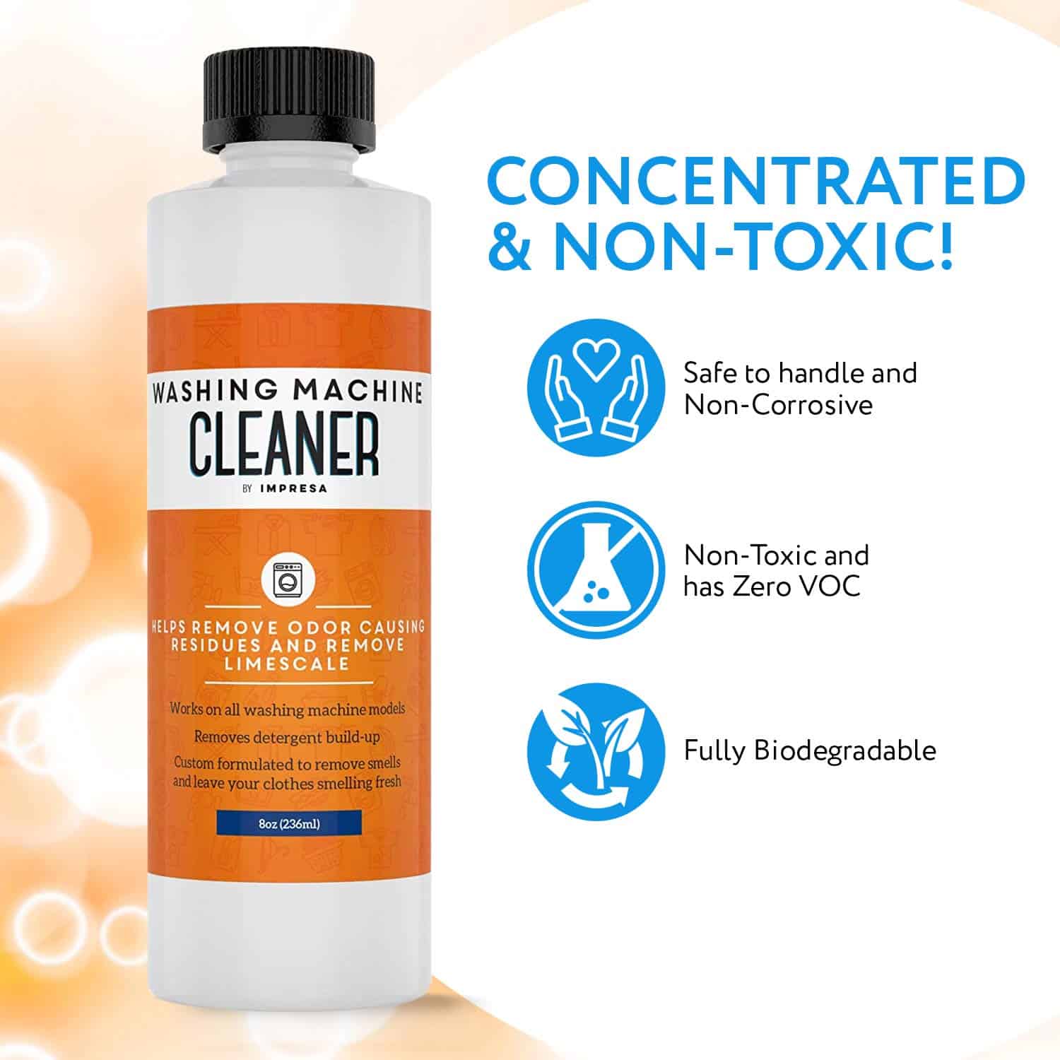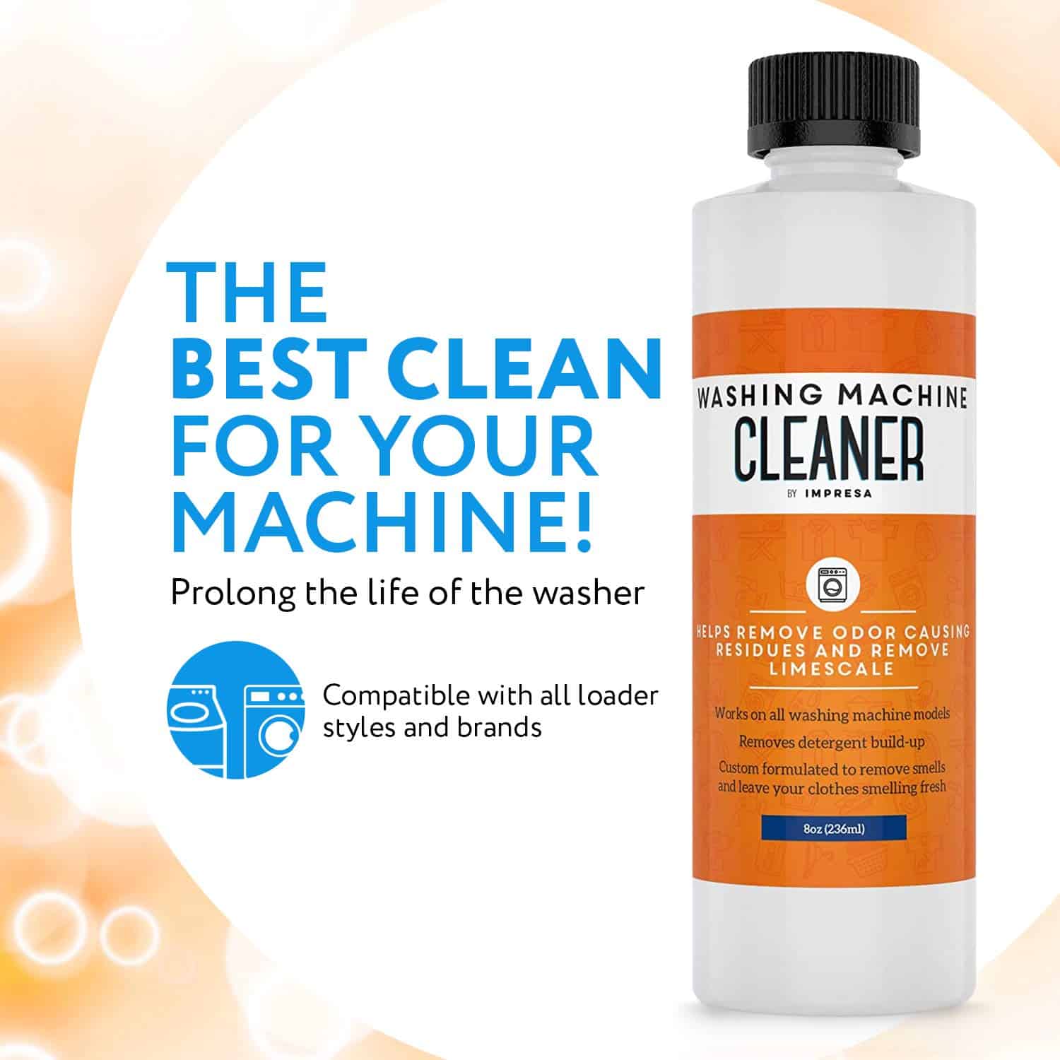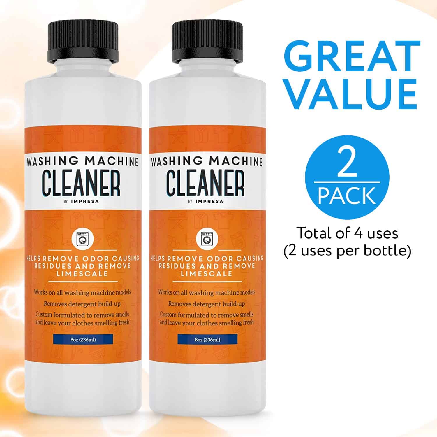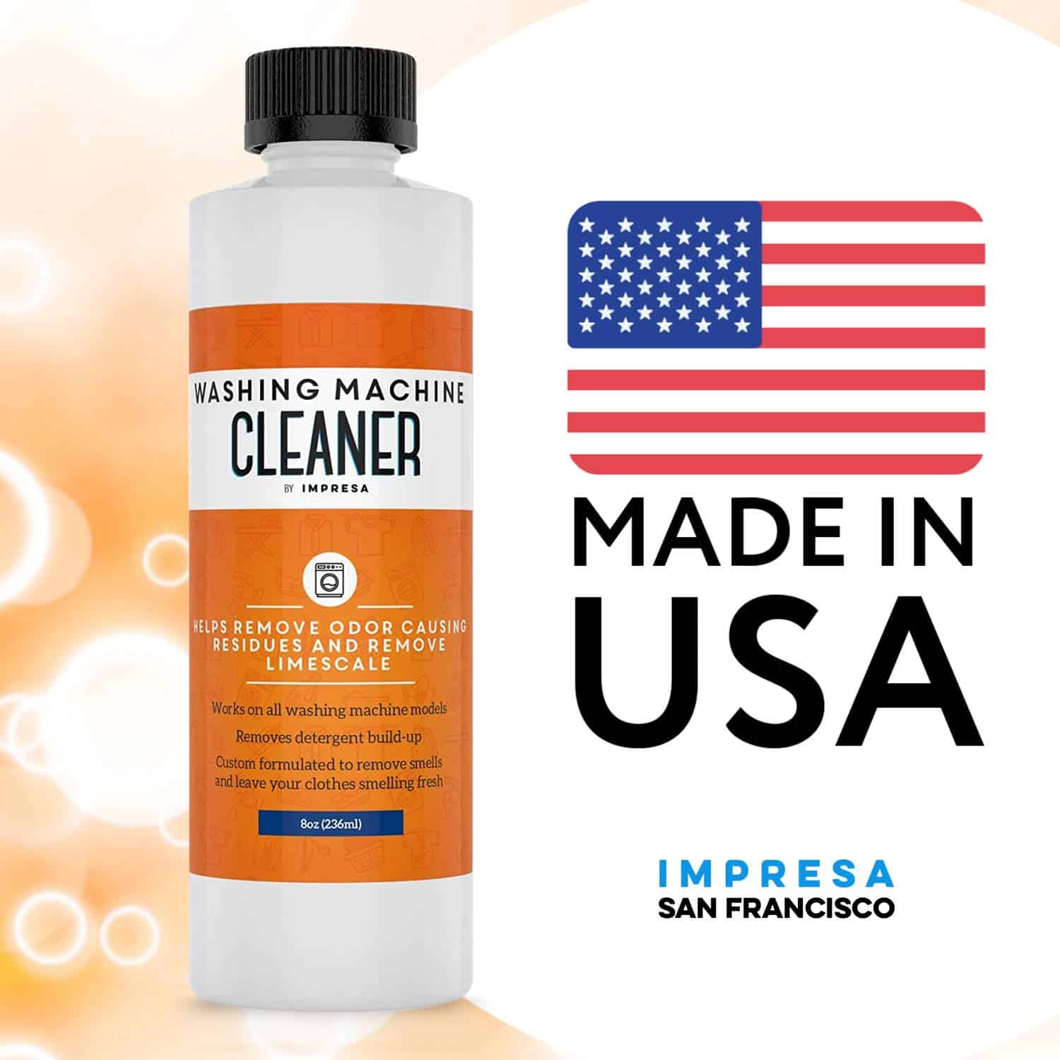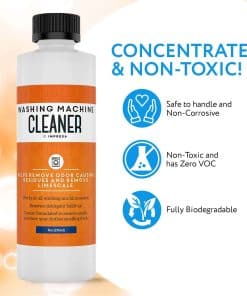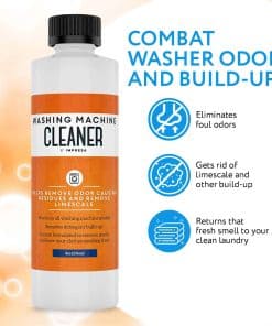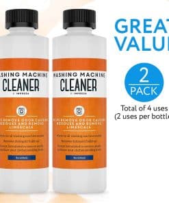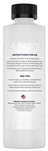 Impresa Products – Limpieza de Lavadoras Hemos formulado nuestro limpiador líquido para lavadoras para que no solo sea altamente efectivo sino también 100% seguro y no tóxico/corrosivo. Nuestro producto viene en un paquete de 2 botellas para un total de 4 usos y se produce aquí en EE. UU. Hemos formulado específicamente nuestro limpiador para combatir los olores, eliminar el sarro y erradicar los residuos que pueden acumularse después de un uso prolongado de la lavadora. Si se usa regularmente, nuestro limpiador de lavadora puede prolongar la vida útil de tu máquina: recomendamos usarlo cada 2-3 meses para obtener los mejores resultados posibles. Altamente versátil, se puede usar con todos los tipos de carga como frontal, superior, HE y no-HE; también ha sido diseñado para usar con todas las marcas conocidas como LG, Hotpoint, Frigidaire, GE, Samsung, Bosch, Magic Chef, Miele, Whirlpool. Para obtener instrucciones de uso, consulta las instrucciones de limpieza de tu fabricante y la guía que se encuentra en nuestra botella. Características clave: -Fórmula líquida Combate el sarro, los olores y otras acumulaciones -Ayuda a devolver el olor fresco a tu ropa -No corrosivo No tóxico Cero COV Completamente biodegradable -Hecho en EE. UU. -Paquete doble 4 usos en total -Usar en prácticamente todas las máquinas de marca y tipo de carga